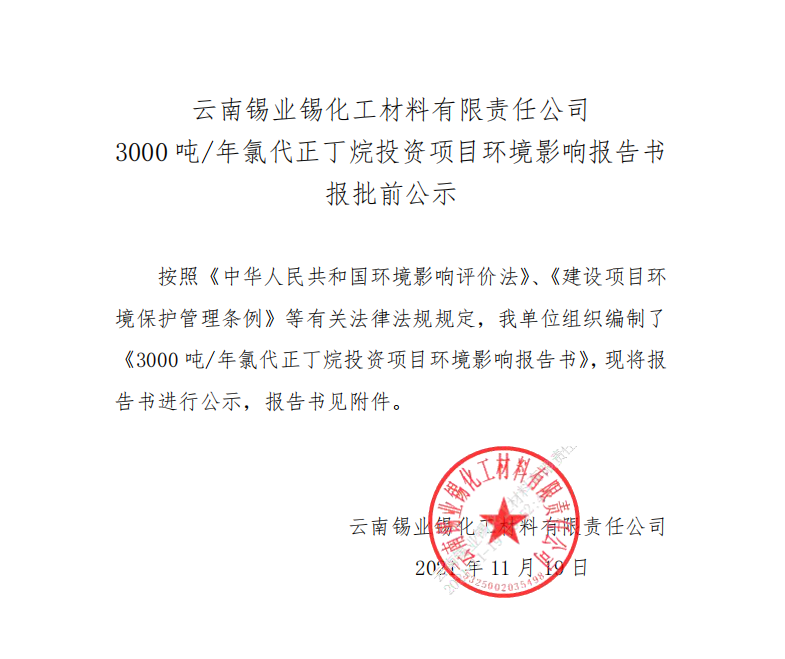云南錫業錫化工材料有限責任公司3000噸/年氯代正丁烷投資項目環境影響報告書報批前公示