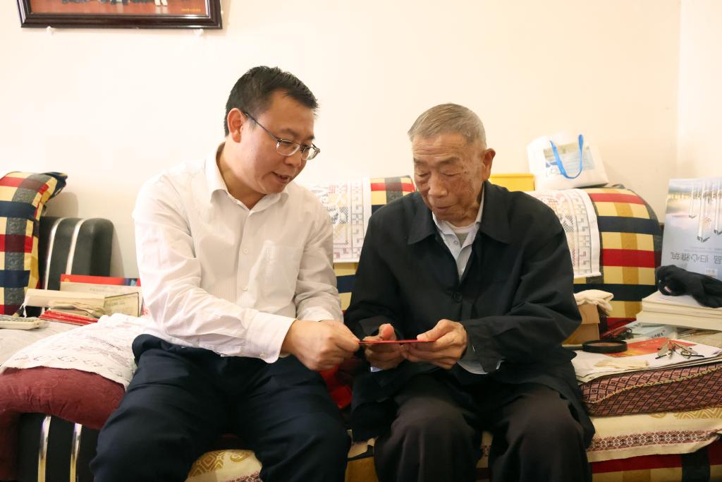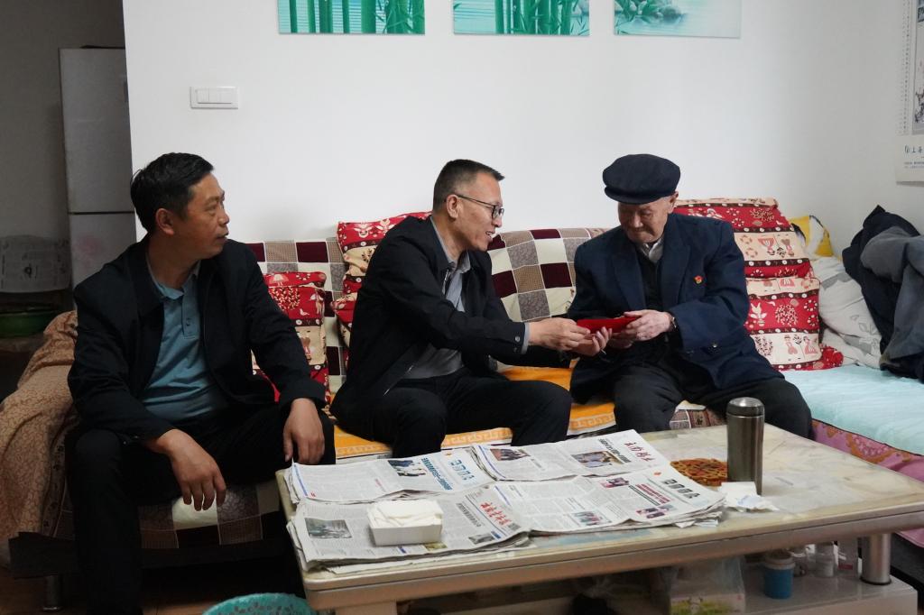 控股公司黨委副書記、副董事長、總經(jīng)理程睿涵走訪慰問卡房分公司離休干部劉繼武(呂林/攝)