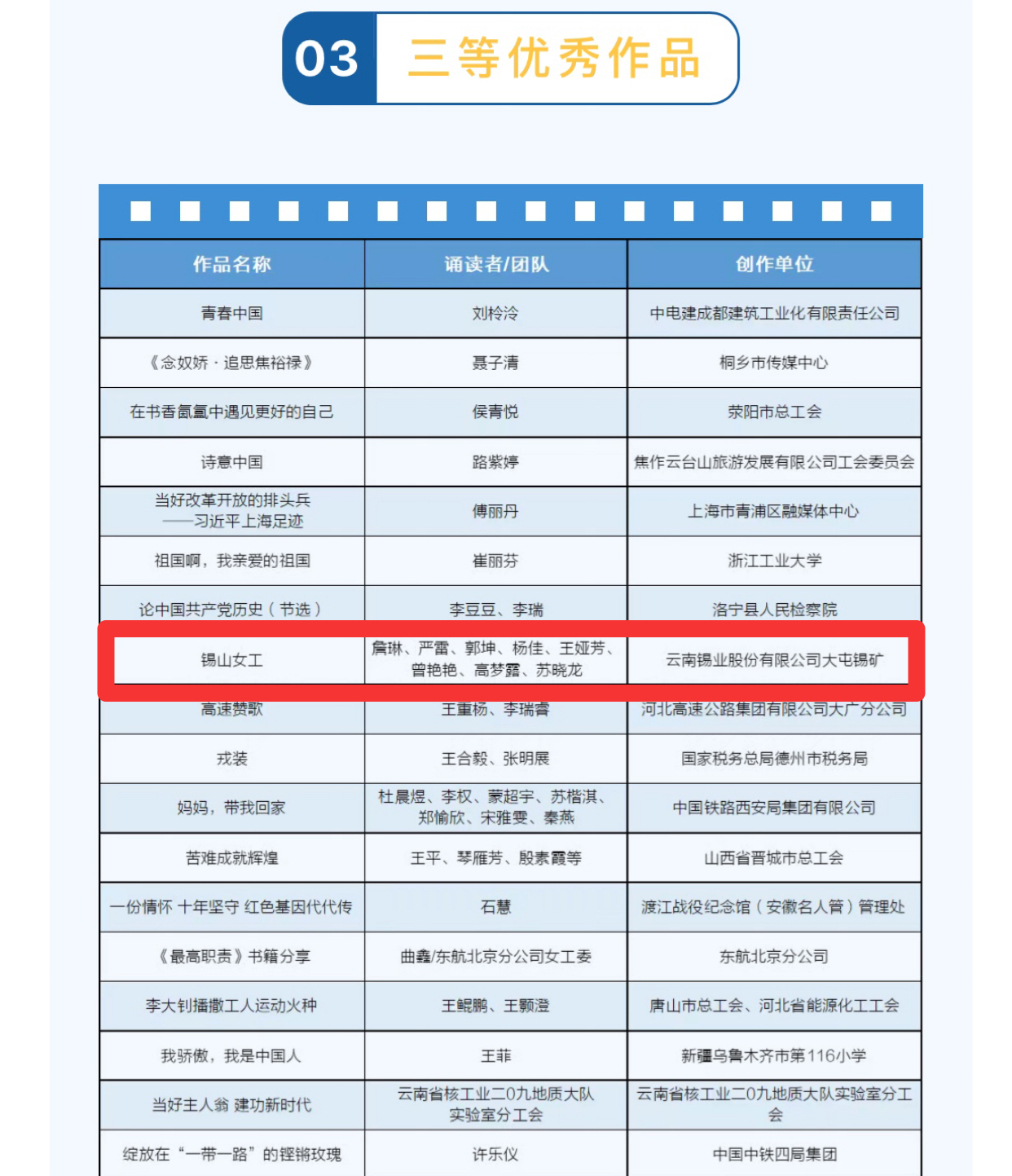 11月10日,由中華全國總工會、中央網(wǎng)信辦主辦,全國職工書屋承辦的2022年“網(wǎng)聚職工正能量 爭做中國好網(wǎng)民”主題活動之“閱讀經(jīng)典好書 爭做中國好網(wǎng)民”主題誦讀比賽活動榜單揭曉。由云錫控股公司工會選送的參賽作品《錫山女工》經(jīng)過層層遴選,在全國近3000部參賽作品中脫穎而出,通過線上展示、網(wǎng)絡(luò)投票和專家評審,成功入圍全國百強作品并榮獲三等獎。云錫控股公司是云南省省屬企業(yè)中唯一的獲獎單位。