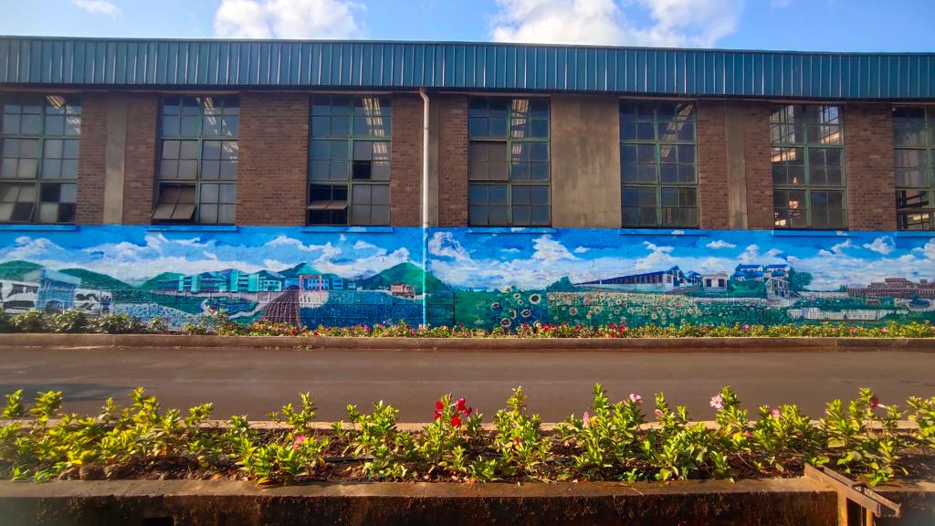 綠樹成蔭的小路,成片的格桑花,爭相怒放的金黃小菊花,充滿寫實浪漫的山水畫,大屯錫礦選礦車間以“綠水青山就是金山銀山”的發展理念打造花園式工廠,用人與自然的和諧相處詮釋了發展與生態的關系,組織職工親手繪就了“錫強有我”文化墻,講述了云錫發展故事。