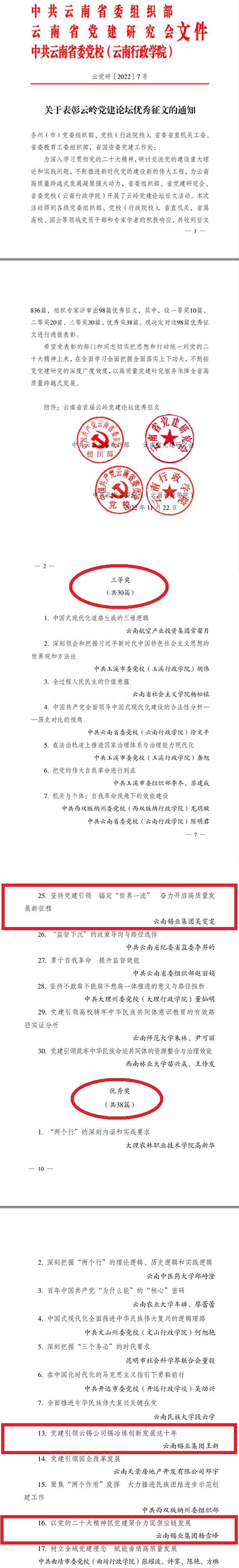 為深入學(xué)習(xí)貫徹黨的二十大精神,研討交流黨的建設(shè)重大理論和實(shí)踐問題,不斷推進(jìn)新時(shí)代黨的建設(shè)新的偉大工程,為云南高質(zhì)量跨越式發(fā)展凝聚強(qiáng)大動(dòng)力,省委組織部、省黨建研究會(huì)、省委黨校(云南行政學(xué)院)開展了云嶺黨建論壇征文活動(dòng)。云錫投稿作品從各級黨委組織部、黨校(行政院校)、省直機(jī)關(guān)、省屬高校、國企等領(lǐng)域黨員干部和專家學(xué)者的征文836篇中脫穎而出,云錫職工吳雯雯撰寫的《堅(jiān)持黨建引領(lǐng) 錨定“世界一流” 奮力開啟高質(zhì)量發(fā)展新征程》獲三等獎(jiǎng),云錫職工王新撰寫的《黨建引領(lǐng)云錫公司錫冶煉創(chuàng)新發(fā)展這十年》和楊雪峰撰寫的《以黨的二十大精神抓黨建聚合力促供應(yīng)鏈發(fā)展》獲優(yōu)秀獎(jiǎng)。