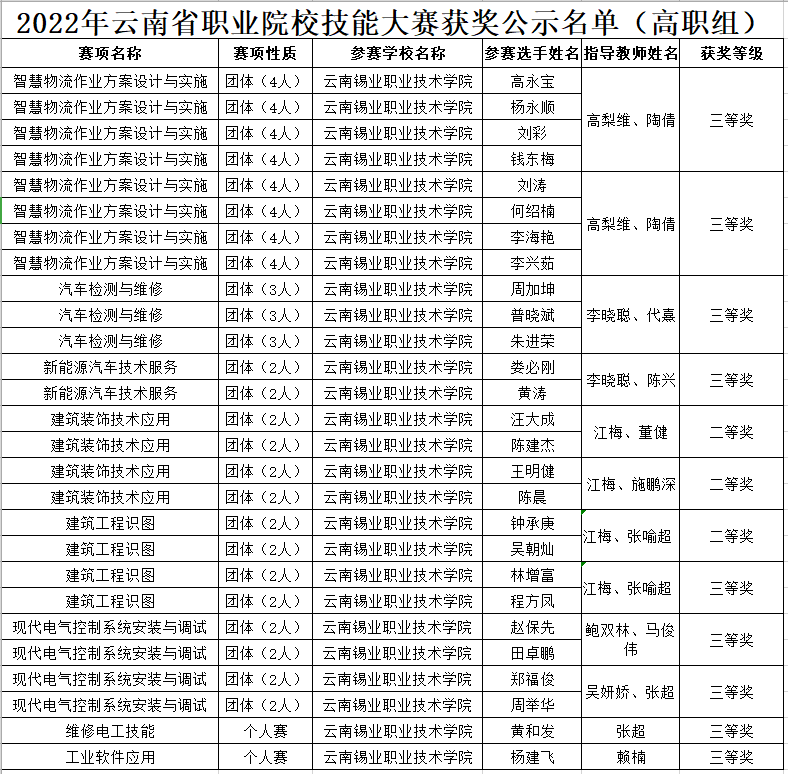 在云南省教育廳日前公布的2022年云南省職業院校技能大賽高職組獲獎名單中,由職業學院14名指導教師、27名學生組成的12個參賽團隊共計斬獲二等獎3項、三等獎9項。