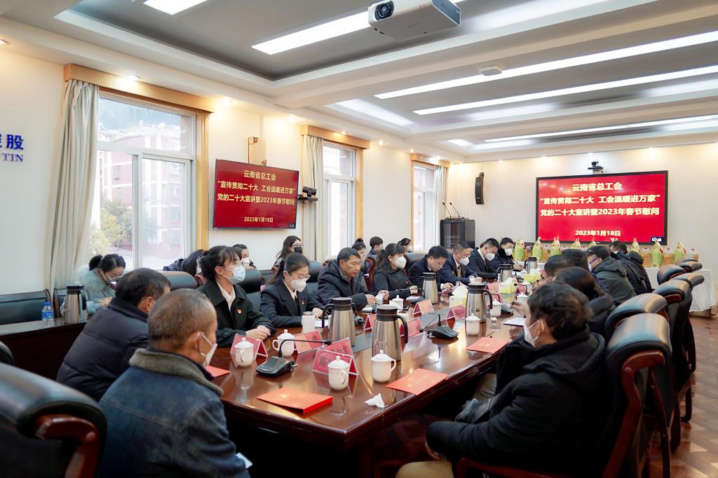 1月18日,云南省總工會兼職副主席蔣秋香率慰問組到云錫集中開展黨的二十大精神宣傳宣講活動,并看望慰問部分2023年元旦春節送溫暖活動對象和省部級勞模代表,為他們送上慰問品和新春祝福。