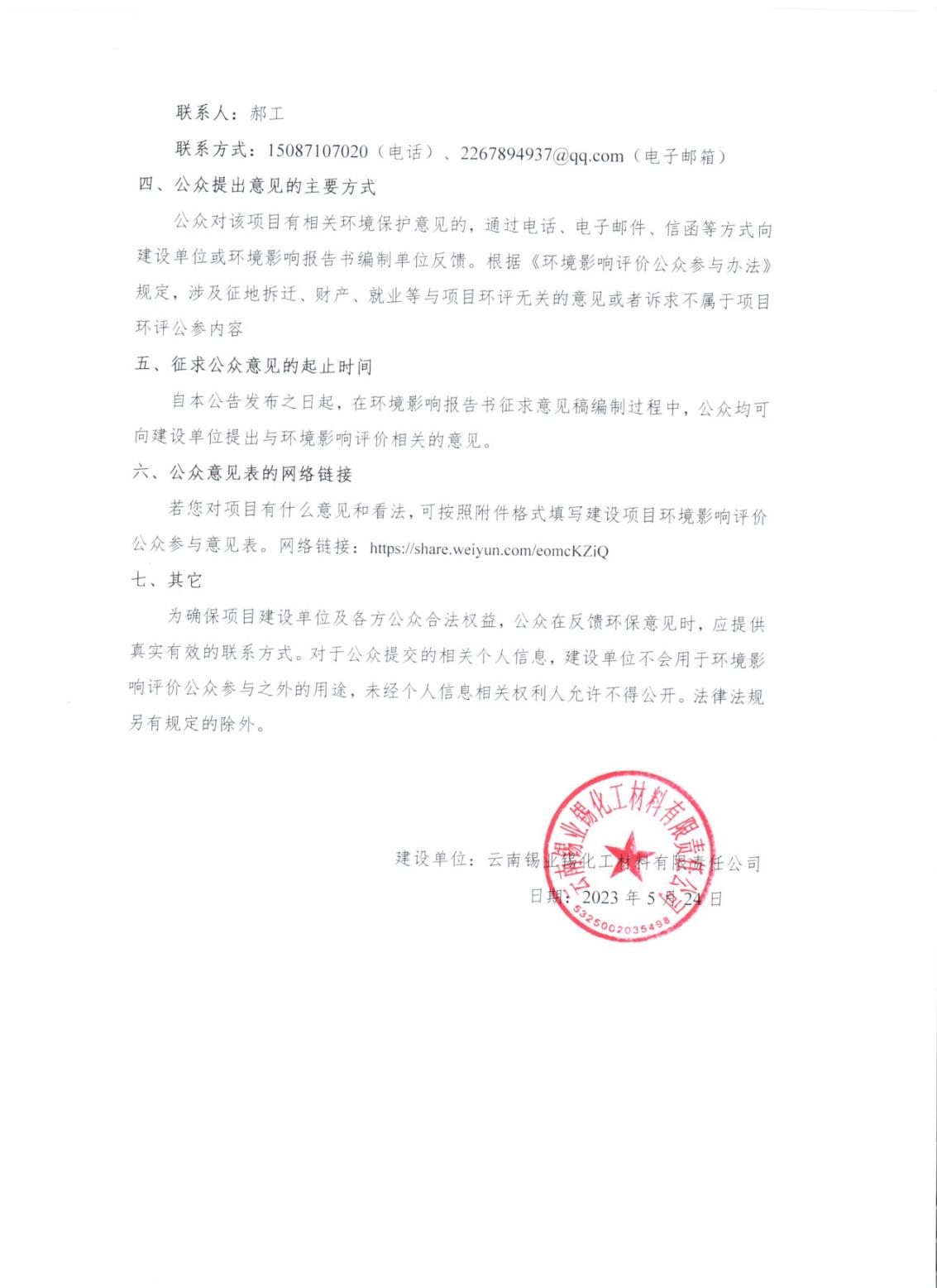 云南錫業錫化工材料有限責任公司6000噸/年錫化工新材料產業鏈升級項目環境影響評價公眾參與信息公示(首次)