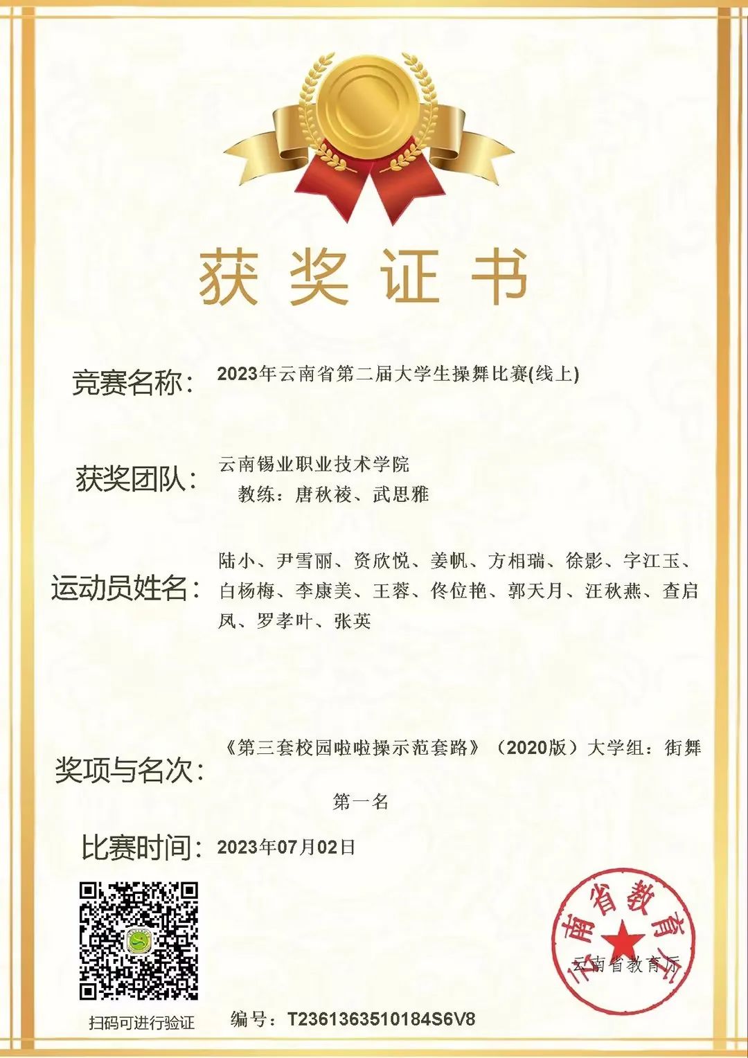“臺上一分鐘,臺下十年功”,驕人的成績背后凝聚了師生辛勤的汗水。她們早晚練、周末練,是夢想、是團隊的力量支撐著不斷努力和堅持下去。經過激烈角逐,《第三套校園啦啦操示范套路》大學組街舞獲得了第一名,《2019年版健美操大眾鍛煉標準》一級、《第三套校園啦啦操示范套路》大學組花球、《2018年普及版民族健身操》、自編校園啦啦操四個項目獲得第二名,2018年廣場舞推廣套路《點贊新時代》獲得第四名,自編廣場舞、《2020版全國大學生街舞推廣套路》Hiphop兩個項目獲得第六名。
