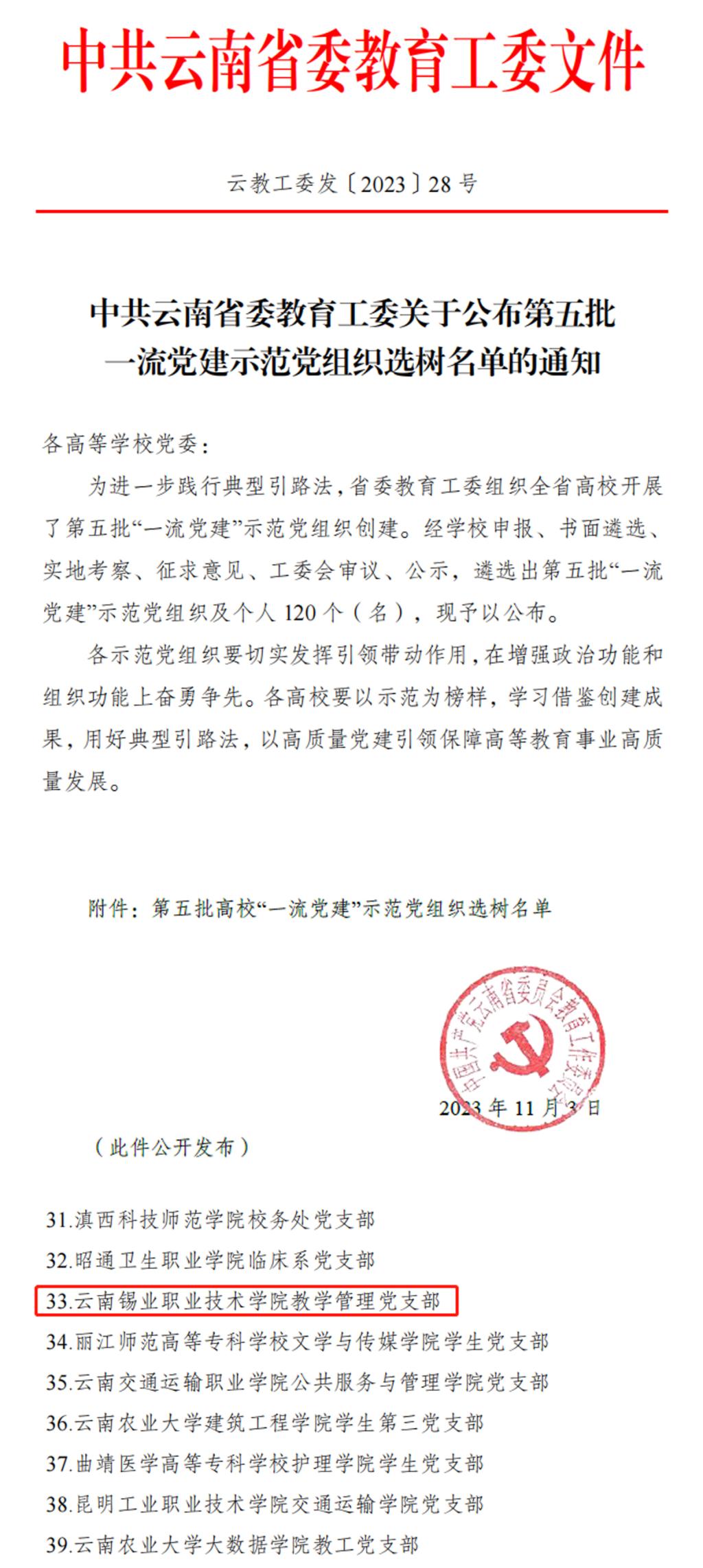近日,中共云南省委教育工委公布第五批“一流黨建”示范黨組織選樹名單,職業學院教學管理黨支部被評為云南省第五批高校“一流黨建”示范黨支部。