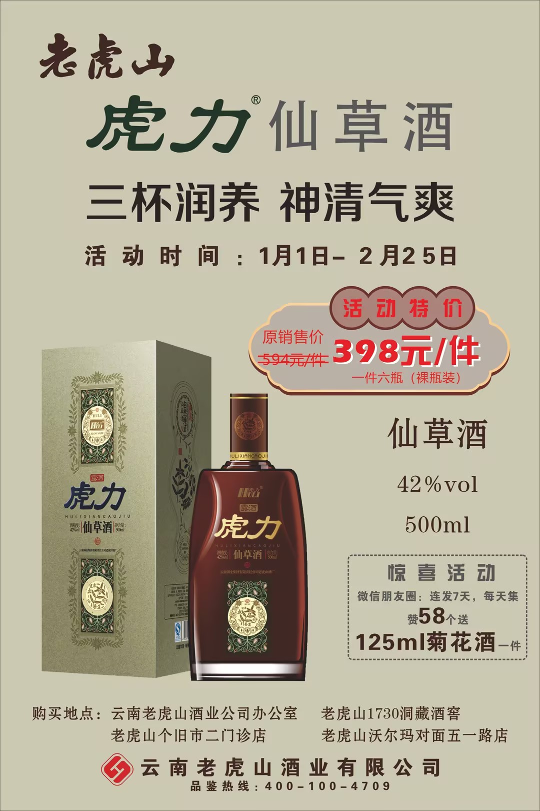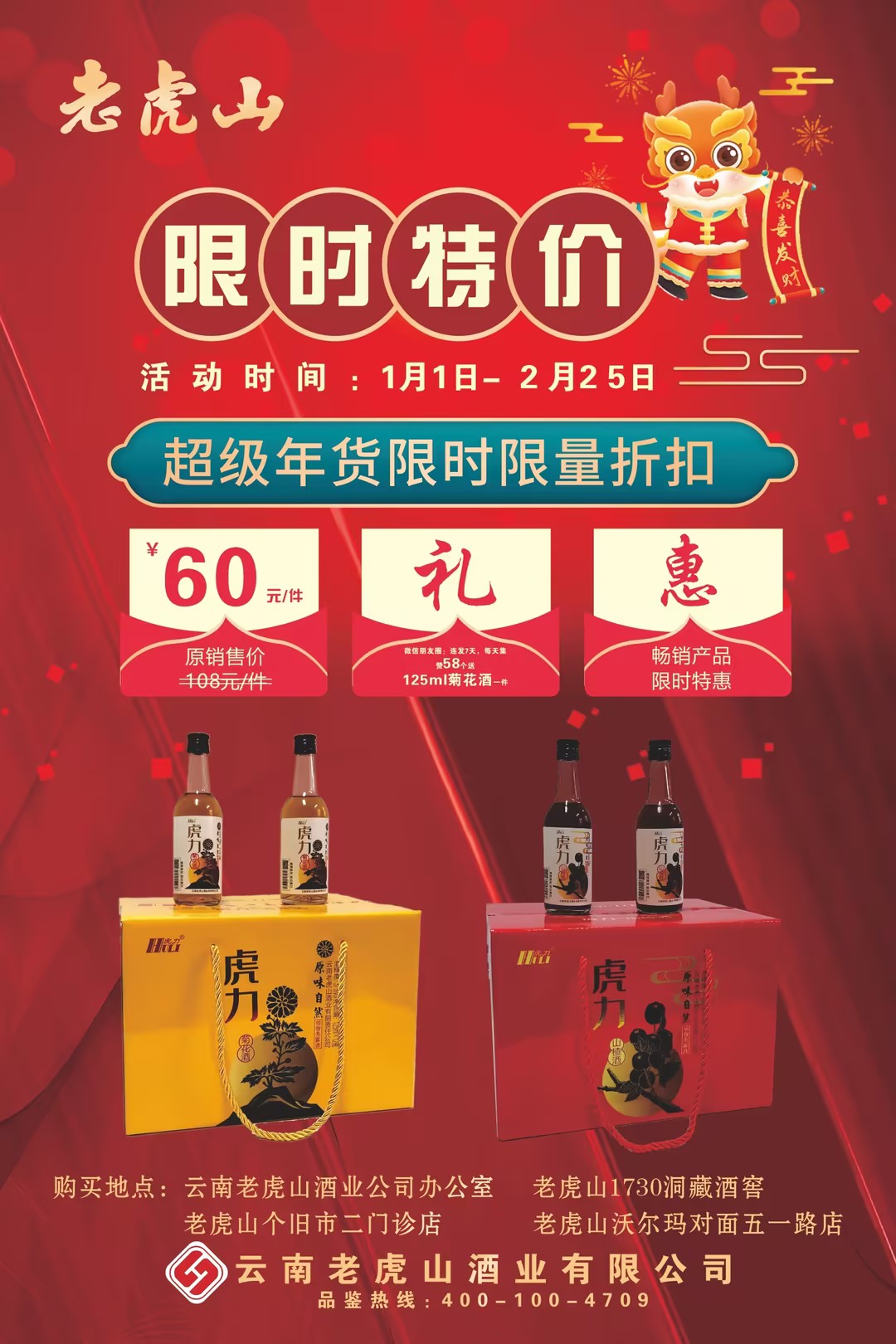 值此新春佳節(jié)即將到來(lái)之際,老虎山酒業(yè)為回饋新老顧客,特推出老虎山系列酒品優(yōu)惠活動(dòng)!口感醇厚,回味悠長(zhǎng),買即享折扣,更有好禮相送!