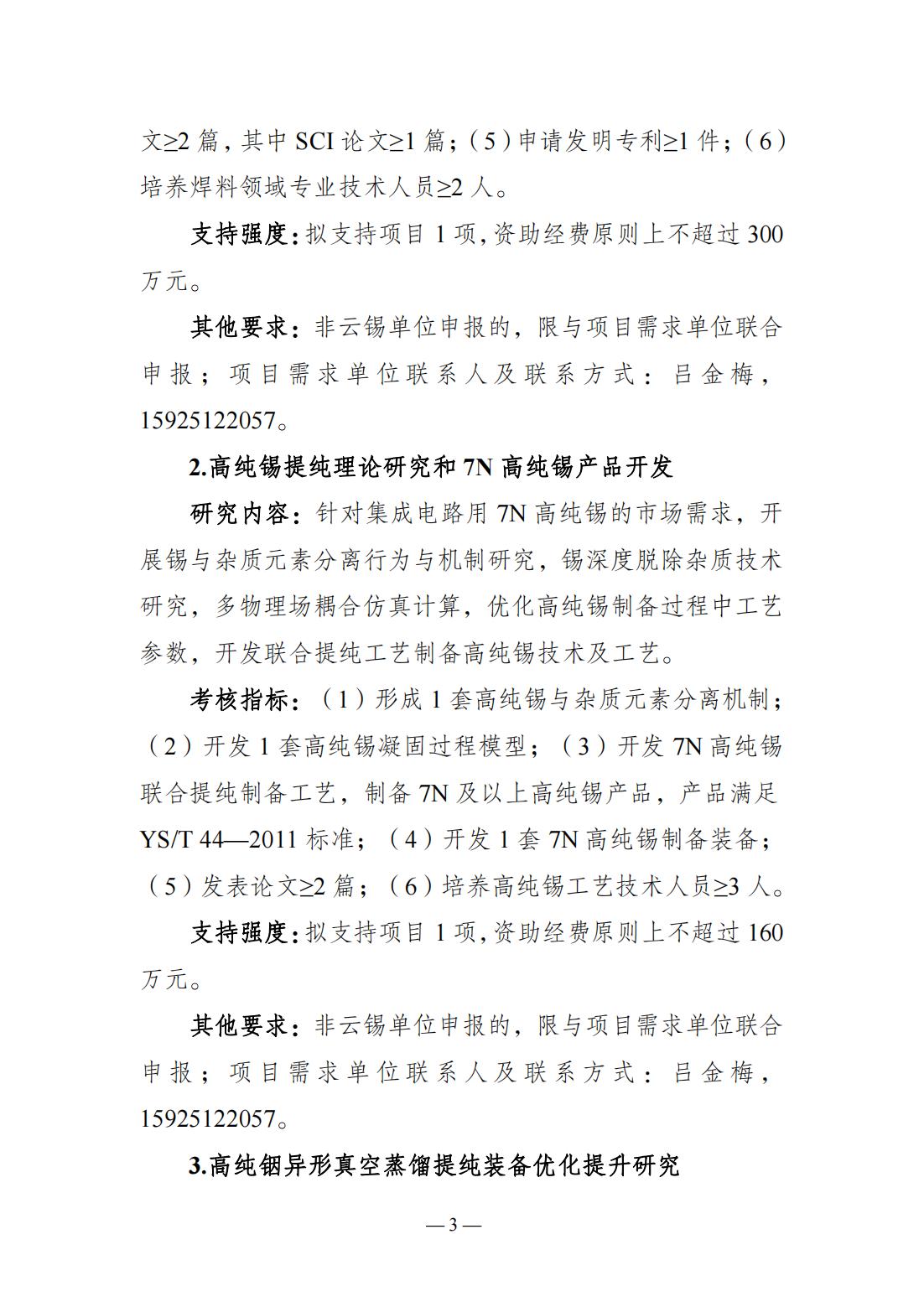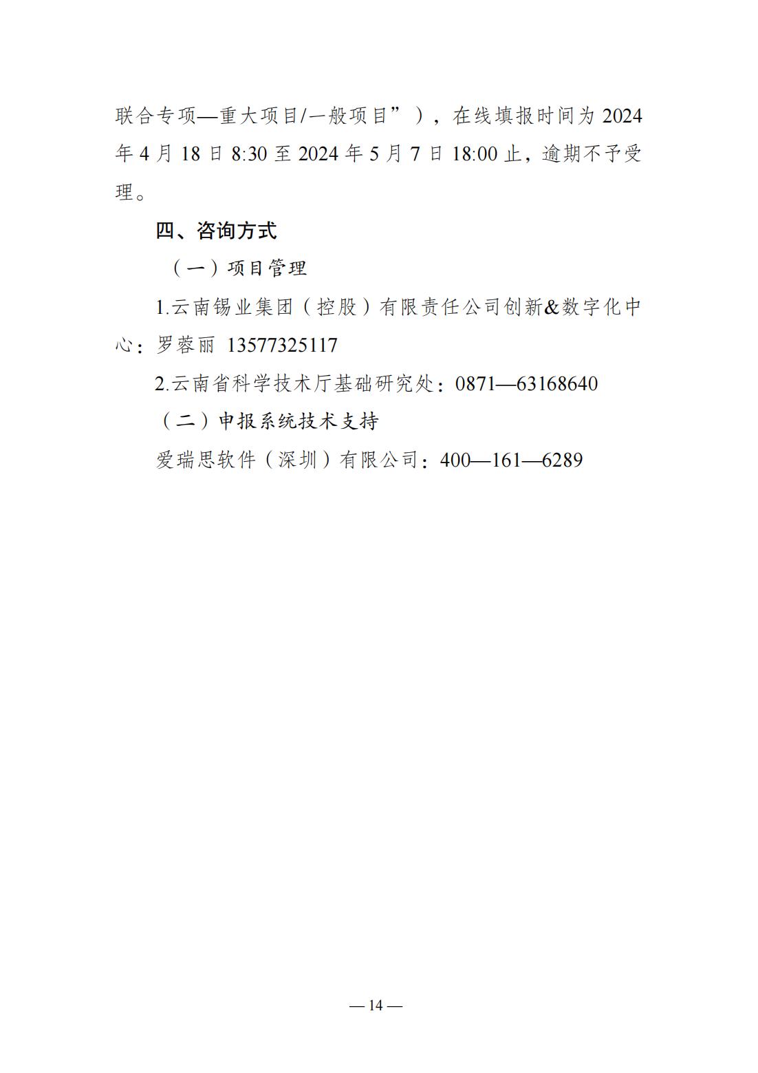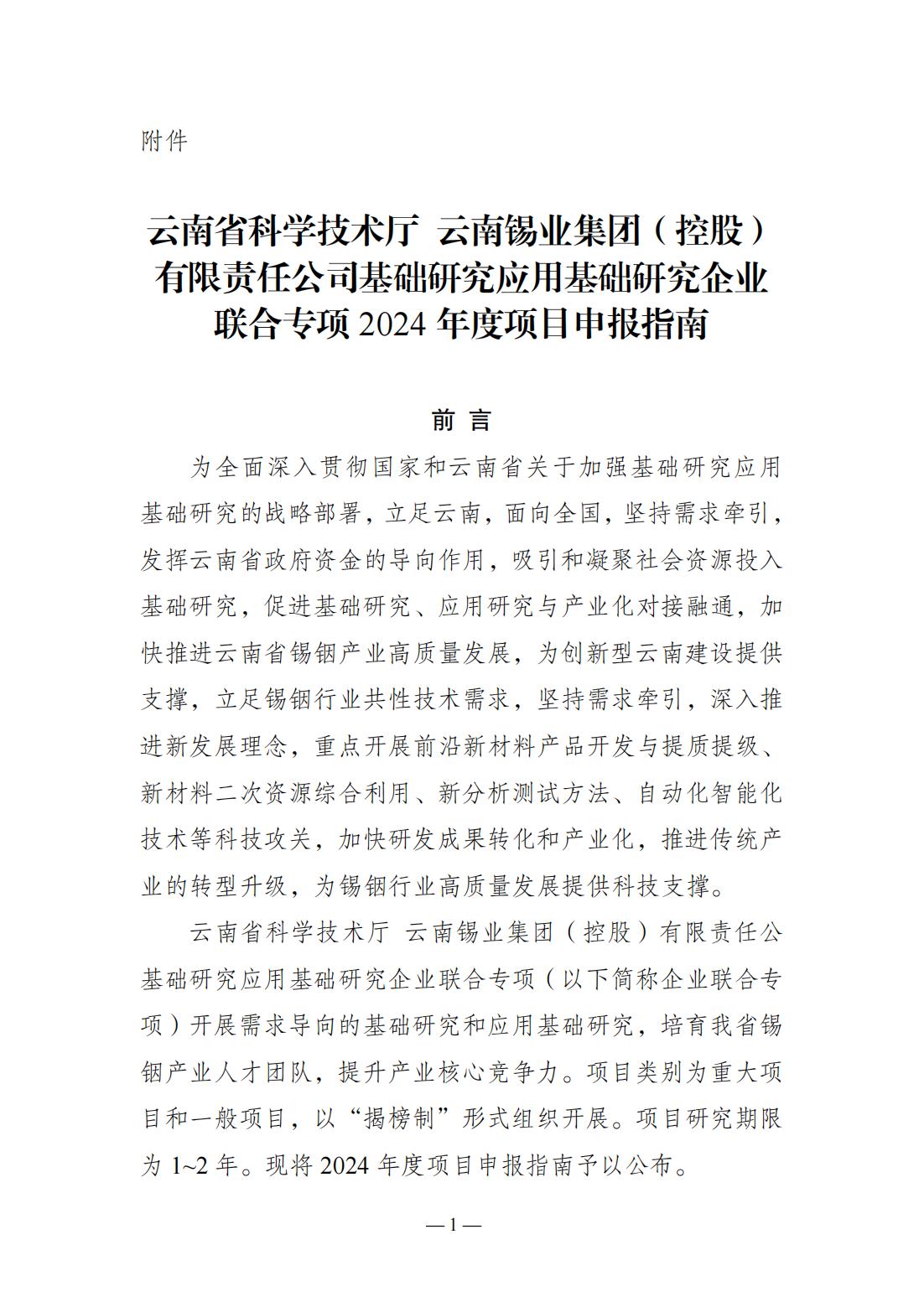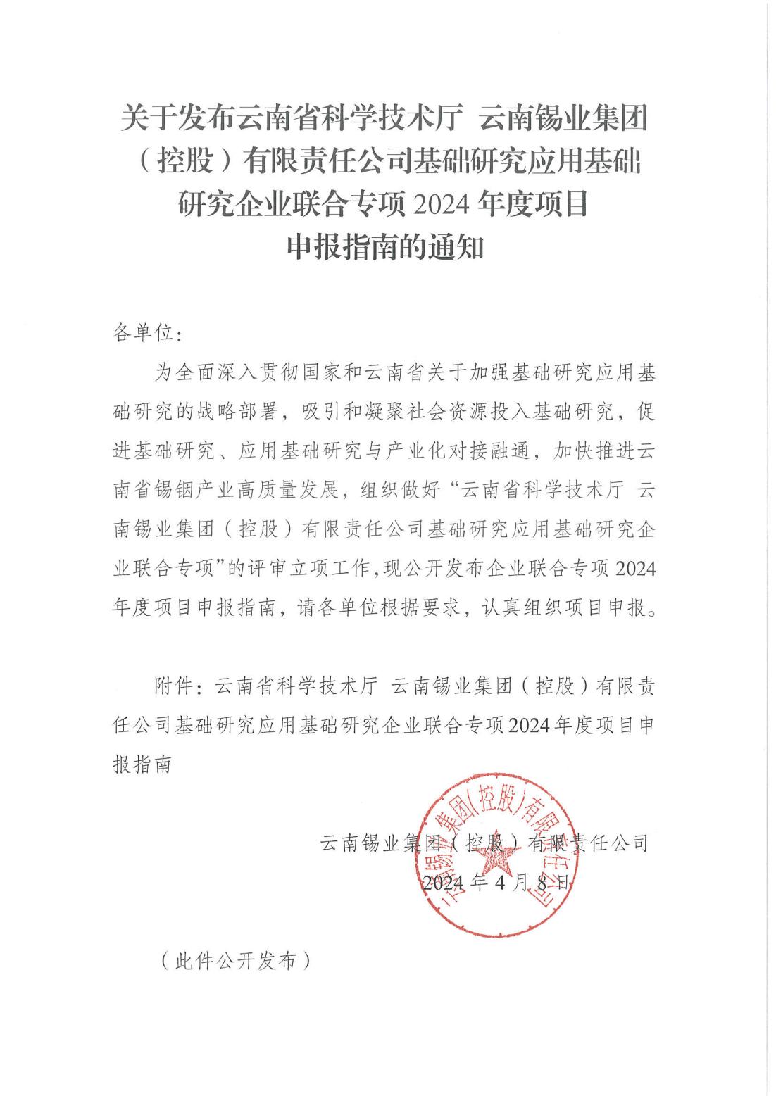 關于發布云南省科學技術廳 云南錫業集團(控股)有限責任公司基礎研究應用基礎研究企業聯合專項2024年度項目申報指南的通知