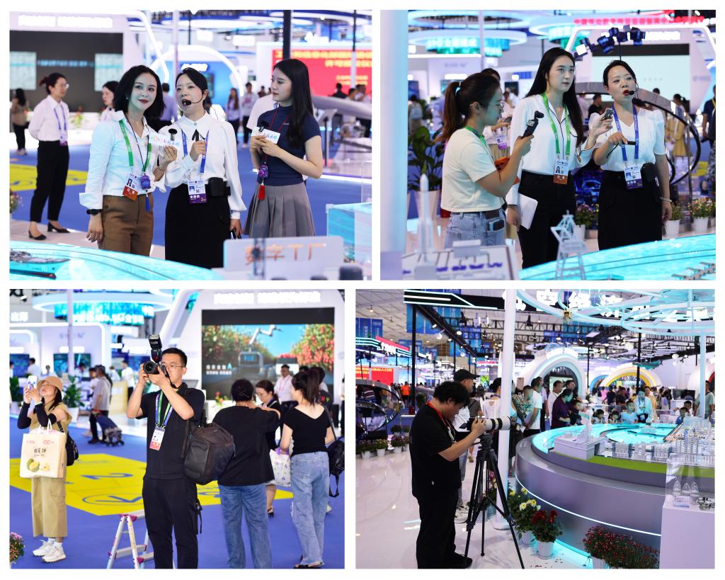 七彩云端、云南網、紅河融媒體及各類自媒體記者相繼到訪,或緊握穩定器移動攝像,給云錫展臺來個富有動感的特寫;或手持話筒,耐心聆聽解說員娓娓道來;或找準心儀的角度,按下快門,為美好瞬間定格……