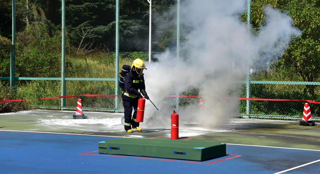 在電氣火災(zāi)處置項(xiàng)目中,選手熟練運(yùn)用消防設(shè)備,反應(yīng)速度快,滅火技巧準(zhǔn),充分展現(xiàn)專業(yè)應(yīng)對(duì)能力。