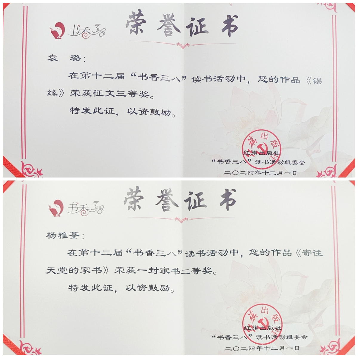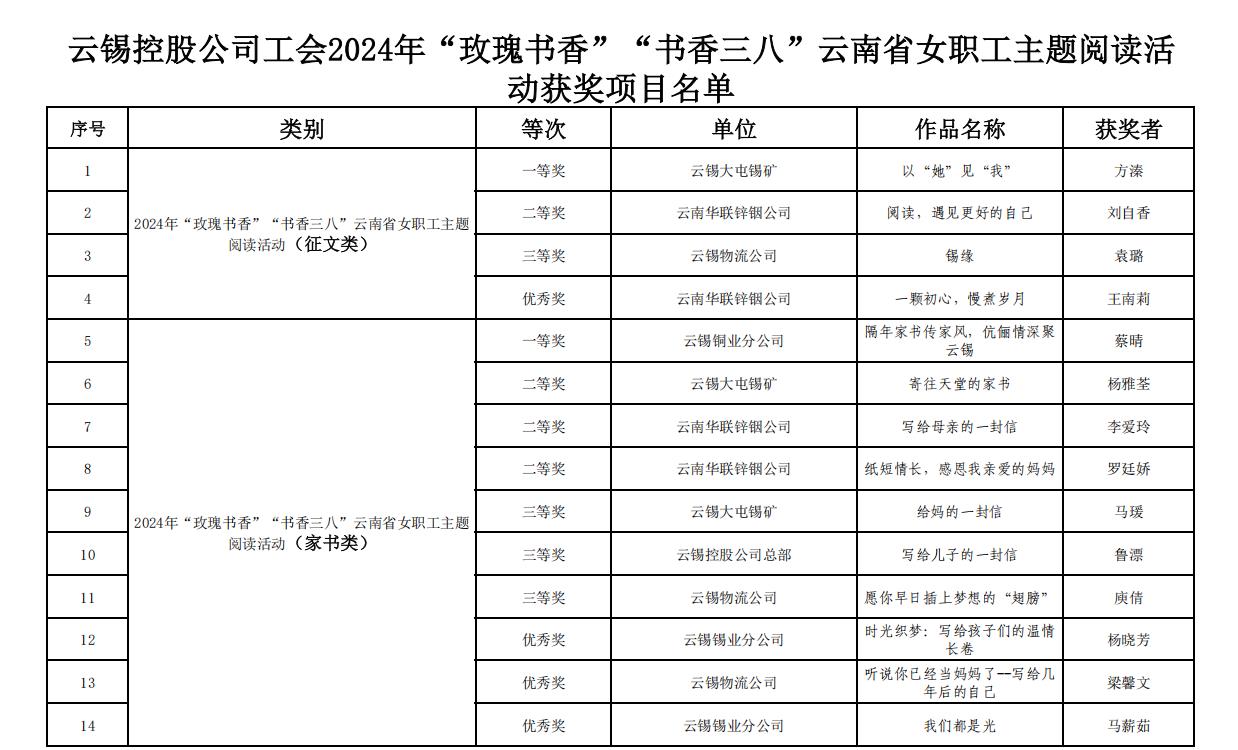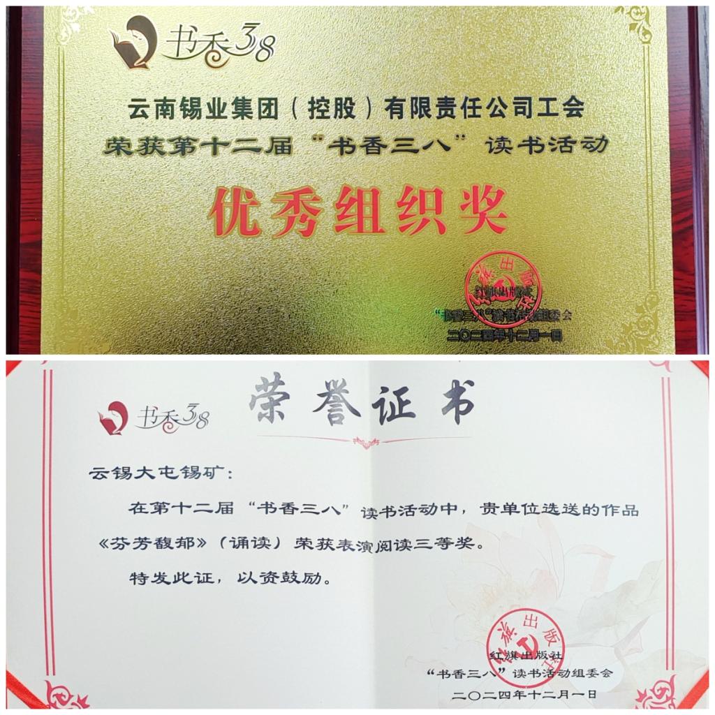 本次活動于2023年12月1日在北京啟動,至2024年8月31日讀書活動作品征集結束,全國共有31個省市、22000多家單位、1100多萬女性朋友參與。組委會共收到各地工會推薦參評作品108989件,其中征文作品53876篇、家書作品30218篇,攝影作品10250件,表演閱讀作品2998件,書畫閱讀作品11647幅(組)。組委會組織相關領域的專家對全部作品進行了初評、復評和終評。大屯錫礦楊雅荃家書類作品《寄往天堂的家書》獲二等獎;物流有限公司袁璐征文類作品《錫緣》獲三等獎;大屯錫礦表演閱讀類作品《芬芳馥郁》獲三等獎。此外,華聯(lián)鋅銦公司劉自香征文類作品《閱讀,遇見更好的自己》、銅業(yè)分公司蔡晴家書類作品《隔年家書傳家風,伉儷情深聚云錫》、新材料公司蘇海濤書畫閱讀類作品《“精”幗工匠 “錫”引未來》等7篇(件)作品獲優(yōu)秀獎。