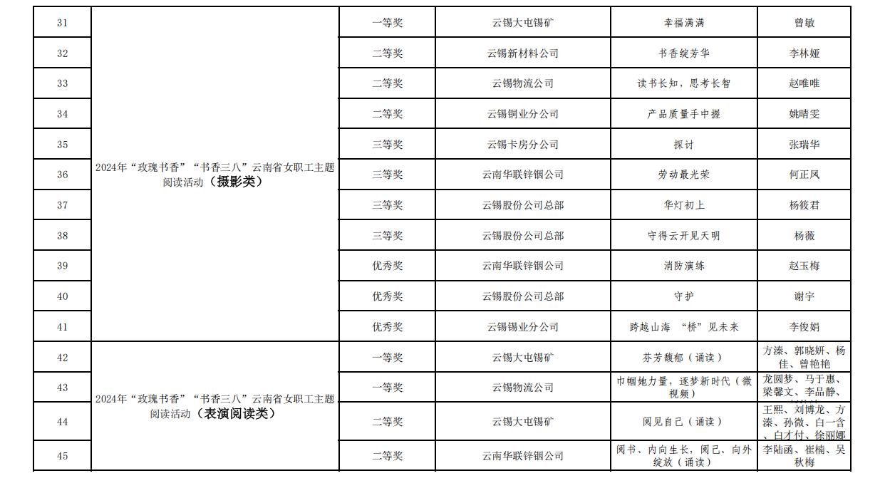 另悉,在云南省女職工主題閱讀活動中,控股公司工會共有45件作品分獲征文類、家書類、書畫類、攝影類、表演閱讀類的一、二、三等獎和優(yōu)秀獎。獲獎名單如下: