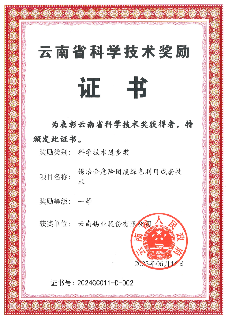 近日,2024年度云南省科學技術獎勵大會在昆明舉行。由昆明理工大學牽頭、錫業股份參與的“錫冶金危險固廢綠色利用成套技術”榮獲云南省科技進步獎一等獎。