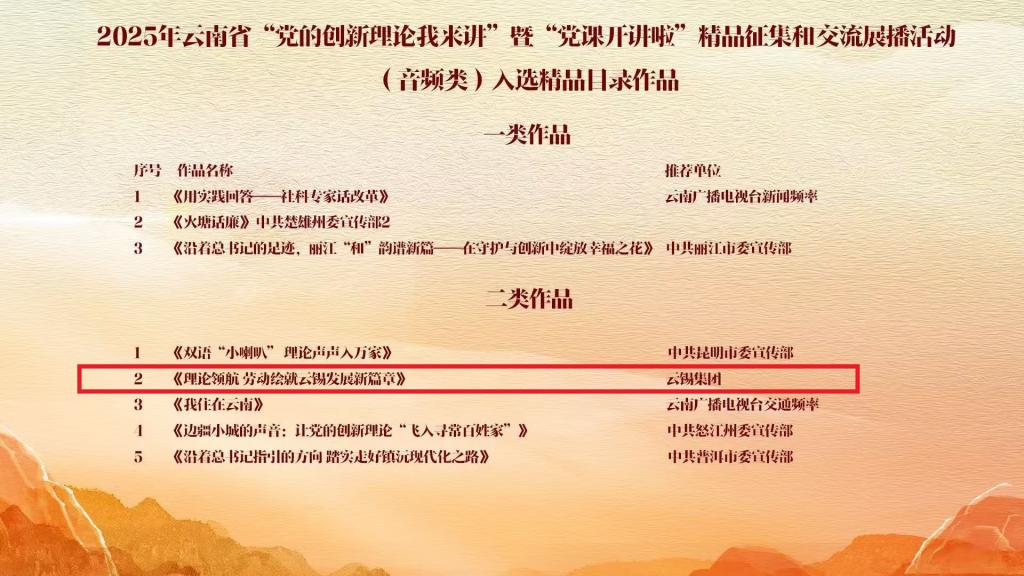 此次作品選送在控股公司黨委的堅強領導下,由控股公司黨群工作部、工會聯合各基層單位精心組織、協同發力、擇優推薦,通過省國資委黨委初審、省委宣傳部組委會評議及專家組評審,職業學院音頻類作品《理論領航 勞動繪就云錫發展新篇章》獲評“二類作品”,被列為2025年全省廣播電視和網絡視聽創新創優扶持項目。新材料公司、錫化工公司、錫業分公司聯合制作的視頻類作品《牢記囑托 感恩奮進 向新而行 錫引未來》獲評“優秀作品”。