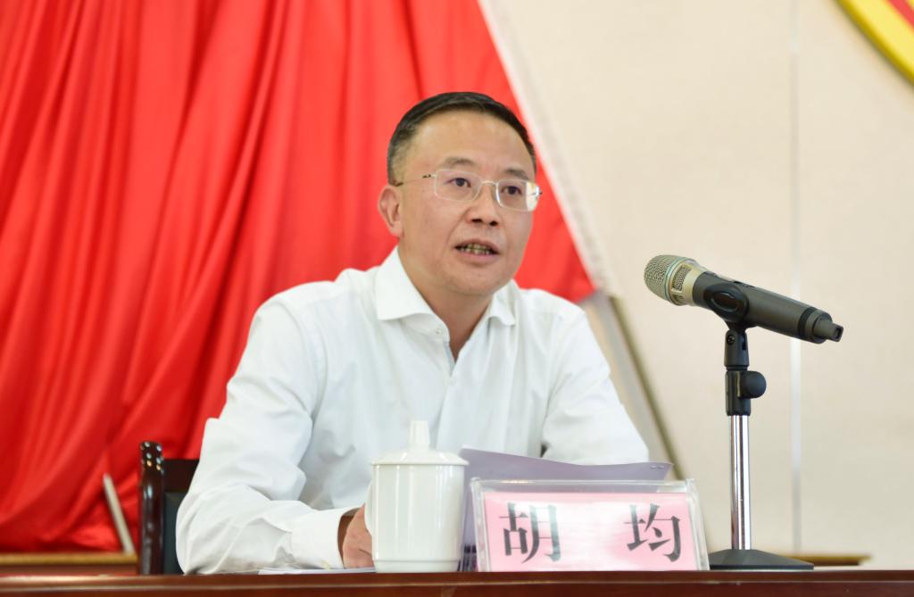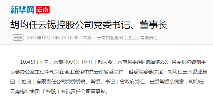 李朝文宣讀中共云南省委文件:省委常委會決定,胡均任云南錫業(yè)集團(控股)有限責任公司黨委委員、常委、書記;省政府黨組、省委常委會同意,胡均任云南錫業(yè)集團(控股)有限責任公司董事長。