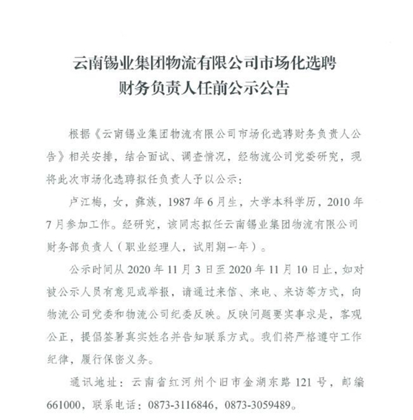 云南錫業集團物流有限公司市場化選聘財務負責人任前公示公告