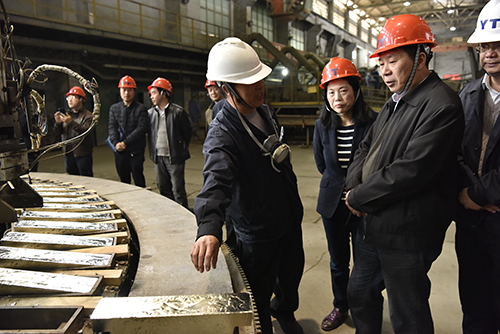 熔煉車間黨支部書記王偉向張濤匯報節日生產情況