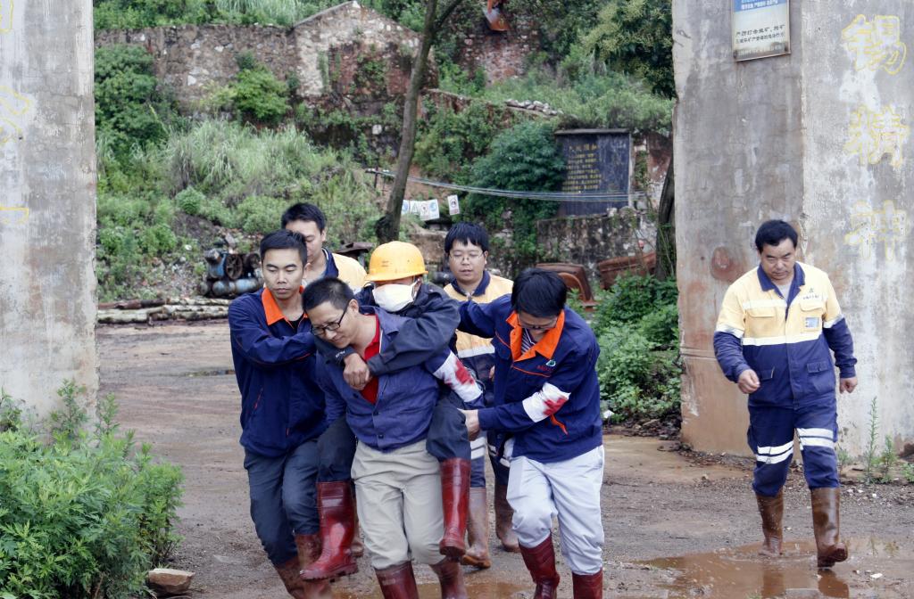 演練模擬2095平面望鄉(xiāng)臺因為連日降雨引發(fā)泥石流,現(xiàn)場管理人員立即報告坑口值班人員,值班人員電話報告礦應(yīng)急指揮部。接到險情報告后,應(yīng)急演練總指揮、副礦長林增洪立即啟動應(yīng)急處理機(jī)制,命令拉響災(zāi)情警報,組織救援人員火速前往事故現(xiàn)場進(jìn)行處置,同時向上級部門報告。