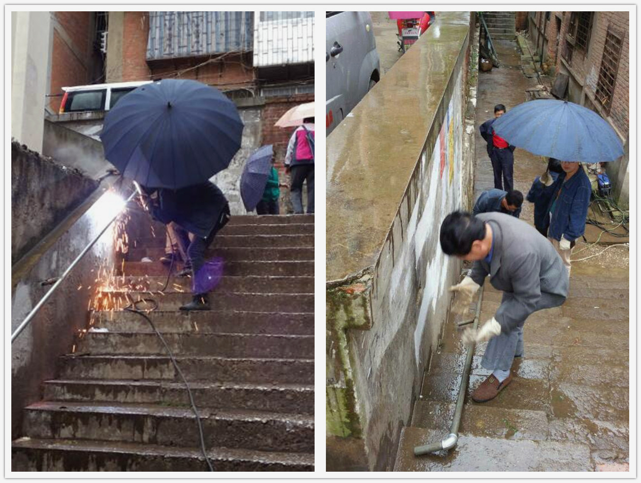 云房物管公司得知情況后,立即組織人員在石階靠擋土墻的一面增設(shè)了欄桿扶手。經(jīng)過(guò)連續(xù)兩小時(shí)冒雨安裝,10余米的欄桿扶手焊接安裝完成。增設(shè)的欄桿扶手安全牢固、美觀實(shí)用,滿足了廣大住戶的需求,受到居民好評(píng)。