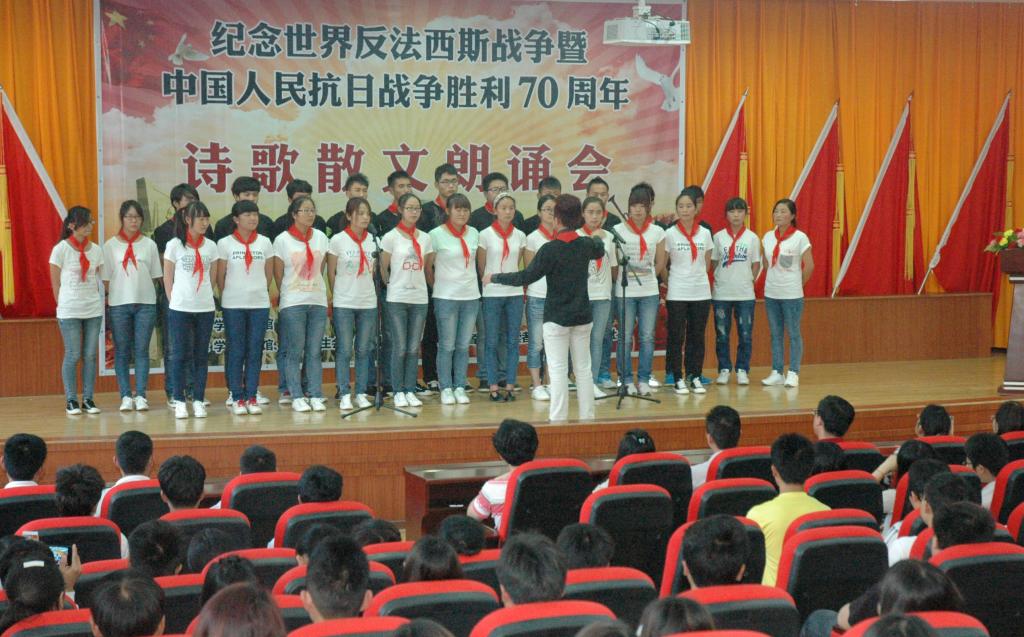 為紀念世界反法西斯戰爭暨中國人民抗日戰爭勝利70周年,警醒廣大師生銘記歷史,傳承愛國主義精神,5月5日19:00,在職業學院黨委的支持下,由圖書館、學生處、學生黨支部、團委和大學生社團共同舉辦的“紀念世界反法西斯戰爭暨中國人民抗日戰爭勝利70周年”詩歌散文朗誦會,在學院五樓報告廳上演。學院黨委常務副書記張躍春、黨委副書記李夢,以及學院300多名師生共同觀看了演出。