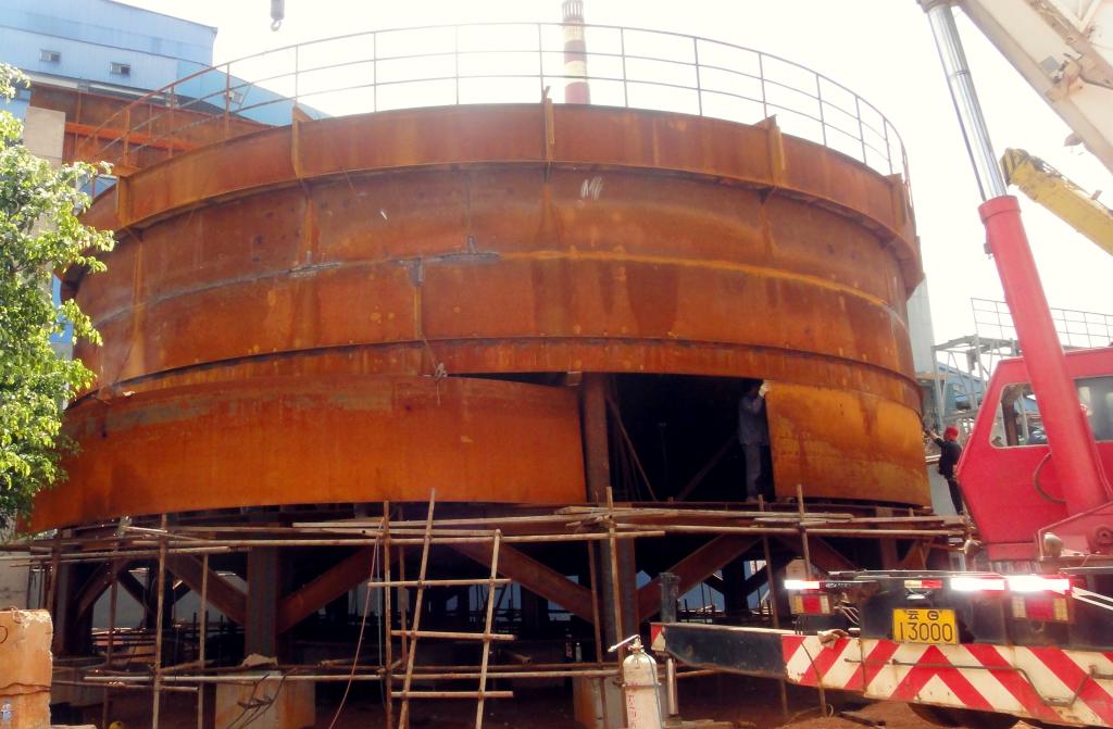 該濃密池殼體直徑16米,重90余噸,是目前國(guó)內(nèi)最大的全鋼結(jié)構(gòu)濃密設(shè)備。由于濃密池體積龐大,鋼結(jié)構(gòu)復(fù)雜,制作要求高,工期又緊,故安裝任務(wù)非常繁重。