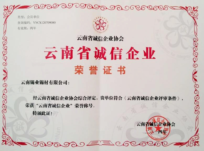5月22日,錫材公司被云南省誠(chéng)信企業(yè)協(xié)會(huì)授予“云南省誠(chéng)信企業(yè)”稱(chēng)號(hào)。