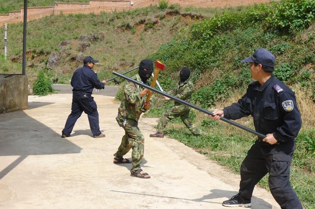 演練開始后,三名恐怖分子蒙面,手持大刀、斧頭避開視頻監控,悄悄摸進儲運背陰山沖炸藥庫監控值班室,用大刀威逼值班的一名人員交出炸藥庫房鑰匙,并把監控通訊設施破壞,妄想進行盜搶炸藥,在遭到拒絕后,恐怖分子將值班員打傷,捆綁起來。這時一名恐怖分子控制值班室,另外兩名恐怖分子從圍墻翻進庫區,摸到一號庫正準備用斧頭砸開庫房門時,被庫區另外兩名巡邏經警發現,巡邏經警奮勇沖上去與恐怖分子展開激烈搏斗。此時,值班室被恐怖分子捆綁控制的經警,在與恐怖分子周旋時,乘恐怖分子不注意,按響通往生活區的報警電鈴。生活區值班經警聽到庫區電鈴,拿上警棍和最近配備的反恐自制鐵釵迅速沖到庫區,首先將值班室一名恐怖分子抓獲,又趕到庫區和兩名巡邏經警一起將兩名恐怖分子團團圍住,經過全體經警相互配合,殊死搏斗,終于將兩名恐怖分子制服抓獲。