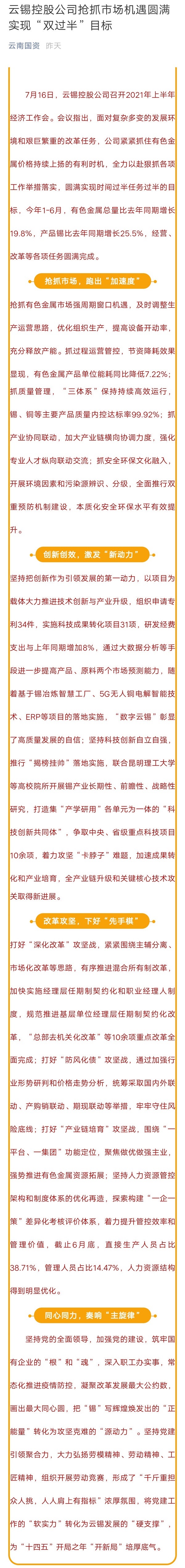 【媒體關注】云南國資:云錫控股公司搶抓市場機遇圓滿實現“雙過半”目標