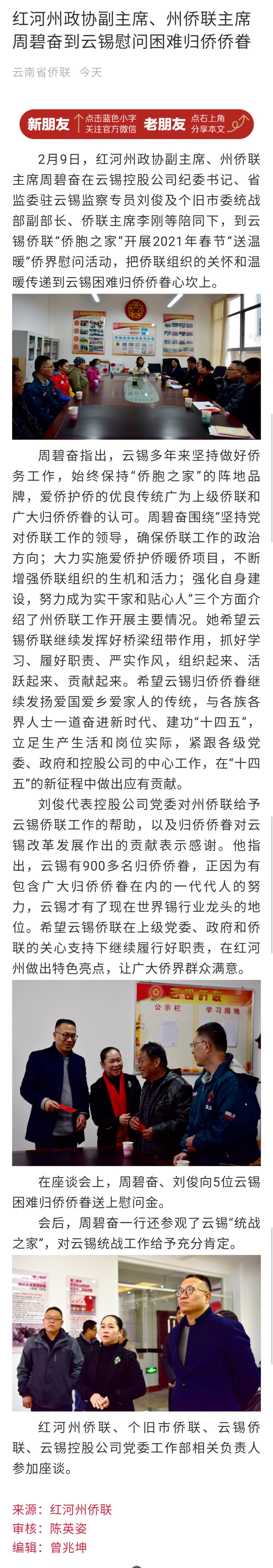 云南省僑聯(lián):紅河州政協(xié)副主席、州僑聯(lián)主席周碧奮到云錫慰問困難歸僑僑眷