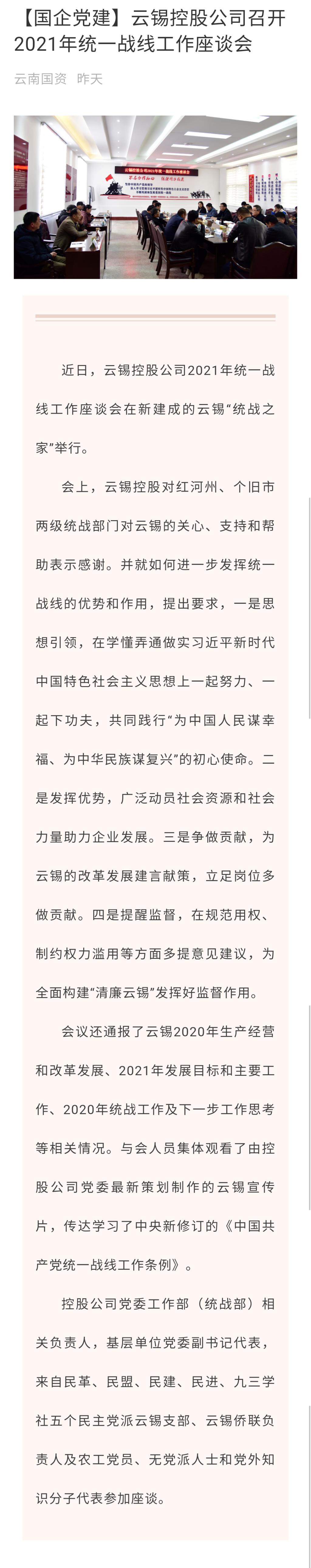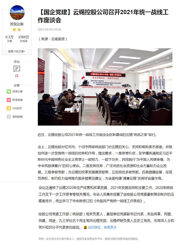 云南國資、搜狐網:【國企黨建】云錫控股公司召開2021年統一戰線工作座談會