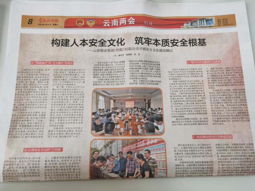 云南錫業(yè)集團(tuán)(控股)有限責(zé)任公司為打造“國內(nèi)一流,國際知名”的行業(yè)安全管理標(biāo)桿企業(yè)創(chuàng)造安全、和諧、良好”的安全文化氛圍,構(gòu)建云錫百年安全文化知名品牌,公司結(jié)合百年積淀的厚重安全文化底瘟,以金川“五階段”安全文化管控集成模式為藍(lán)本,構(gòu)建了云錫安全文化品牌。2017年12月,公司召開云錫安全文化建設(shè)的啟動大會,標(biāo)志著云錫安全文化建沒正式開啟,用文化管安全的理念正在形成。