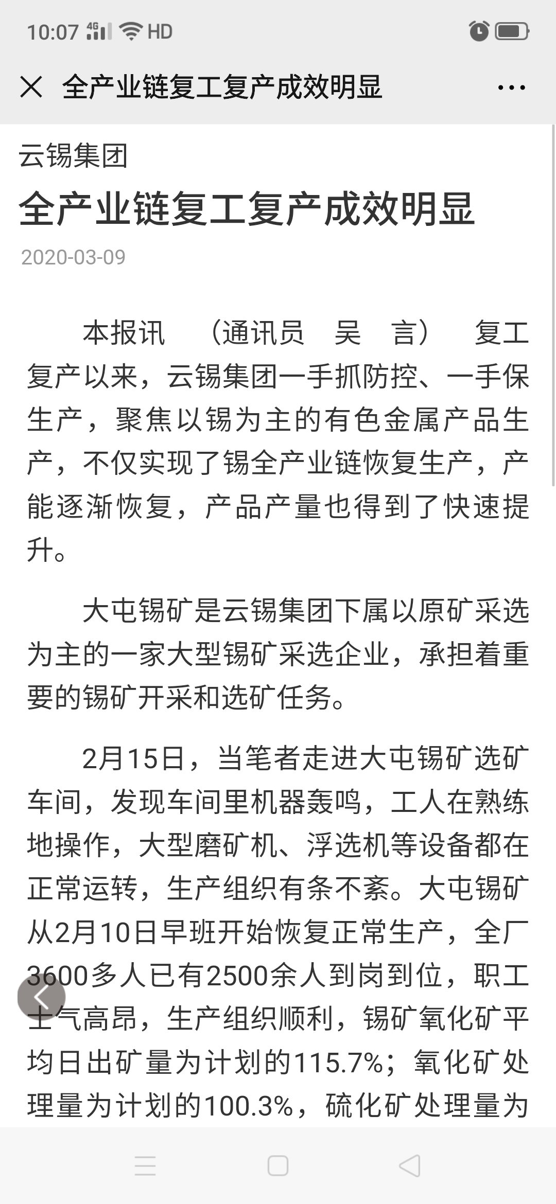 復工復產以來,云錫集團一手抓防控、一手保生產,聚焦以錫為主的有色金屬產品生產,不僅實現了錫全產業鏈恢復生產,產能逐漸恢復,產品產量也得到了快速提升。
