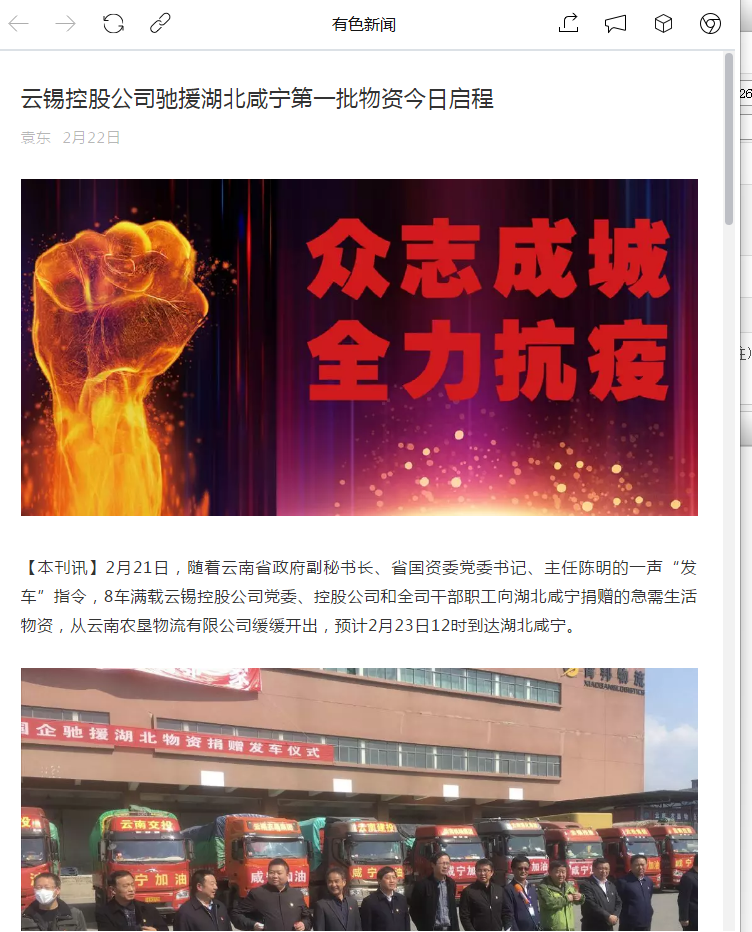 【本刊訊】2月21日,隨著云南省政府副秘書長(zhǎng)、省國(guó)資委黨委書記、主任陳明的一聲“發(fā)車”指令,8車滿載云錫控股公司黨委、控股公司和全司干部職工向湖北咸寧捐贈(zèng)的急需生活物資,從云南農(nóng)墾物流有限公司緩緩開出,預(yù)計(jì)2月23日12時(shí)到達(dá)湖北咸寧。