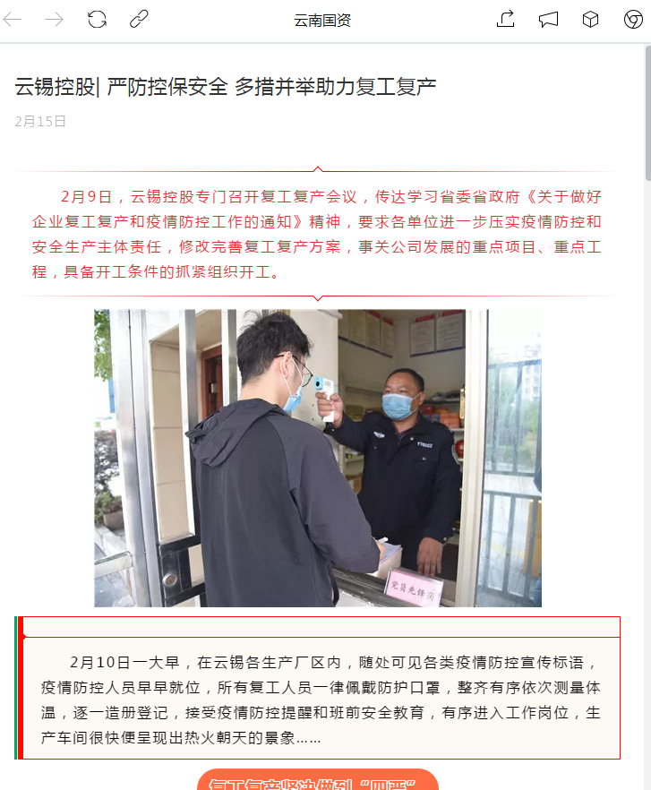 2月9日,云錫控股公司專門召開復工復產會議,傳達學習省委省政府《關于做好企業復工復產和疫情防控工作的通知》精神,要求各單位進一步壓實疫情防控和安全生產主體責任,修改完善復工復產方案,事關公司發展的重點項目、重點工程,具備開工條件的抓緊組織開工。