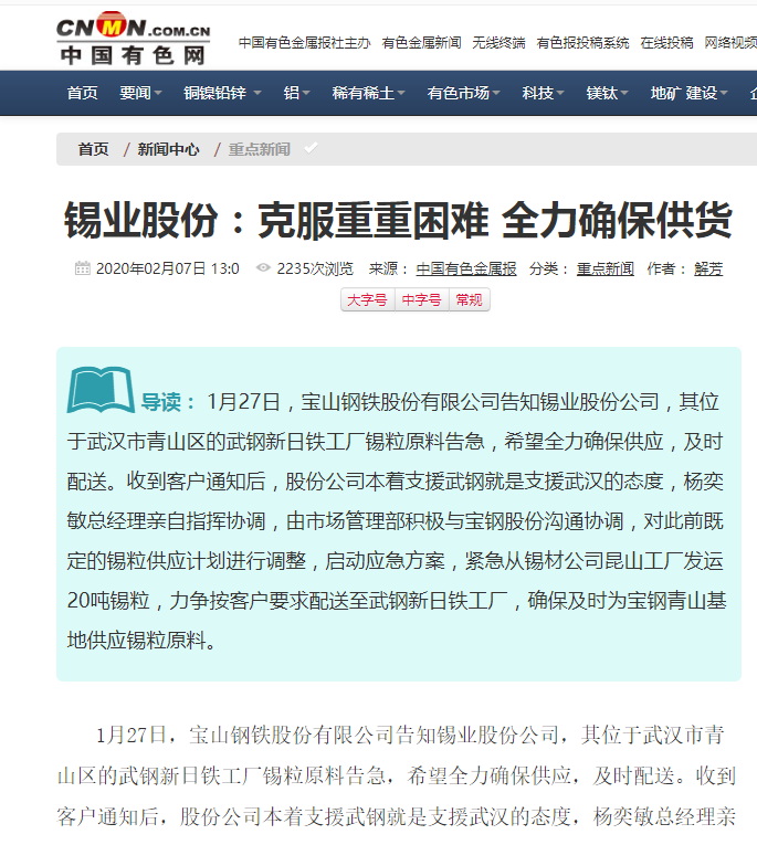 1月27日,寶山鋼鐵股份有限公司告知錫業股份公司,其位于武漢市青山區的武鋼新日鐵工廠錫粒原料告急,希望全力確保供應,及時配送。收到客戶通知后,股份公司本著支援武鋼就是支援武漢的態度,楊奕敏總經理親自指揮協調,由市場管理部積極與寶鋼股份溝通協調,對此前既定的錫粒供應計劃進行調整,啟動應急方案,緊急從錫材公司昆山工廠發運20噸錫粒,力爭按客戶要求配送至武鋼新日鐵工廠,確保及時為寶鋼青山基地供應錫粒原料。