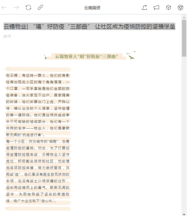 在“唱”好防疫“三部曲”的同時,云錫物業人也積極用好宣傳陣地,呼吁住戶高度重視疫情。各小區物業工作人員掛出橫幅標語,并通過張貼溫馨提示、倡議書以及微信公眾號、業主微信群等線上“轟炸式”的信息告知,提醒住戶 注意個人防護,科學做好疫情防控措施。