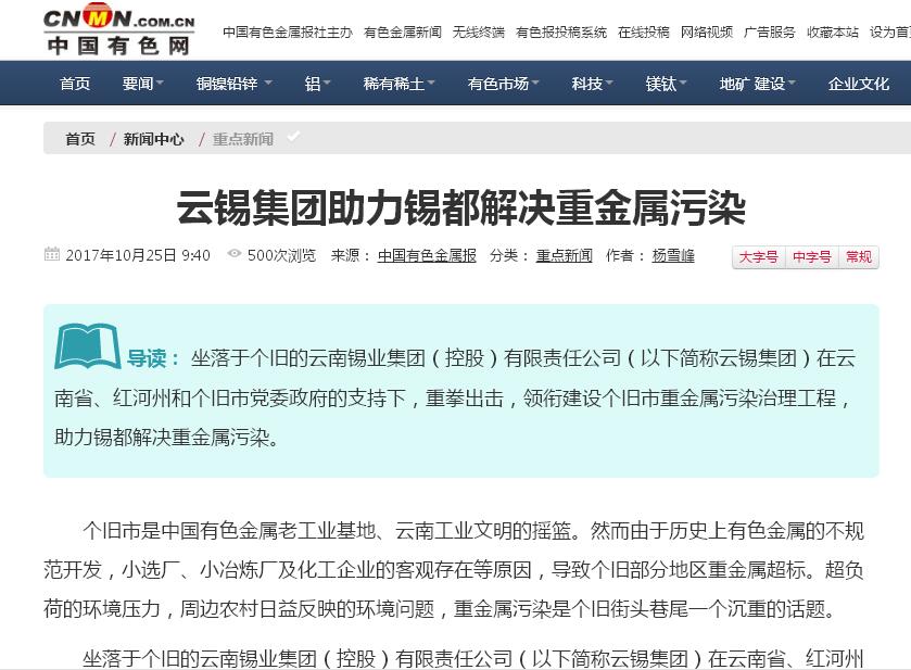 云錫集團作為國有特大型企業集團,承擔起國有企業的社會責任。與個舊市委、市政府,加強溝通協作,有效推進重金屬污染綜合防治工作。