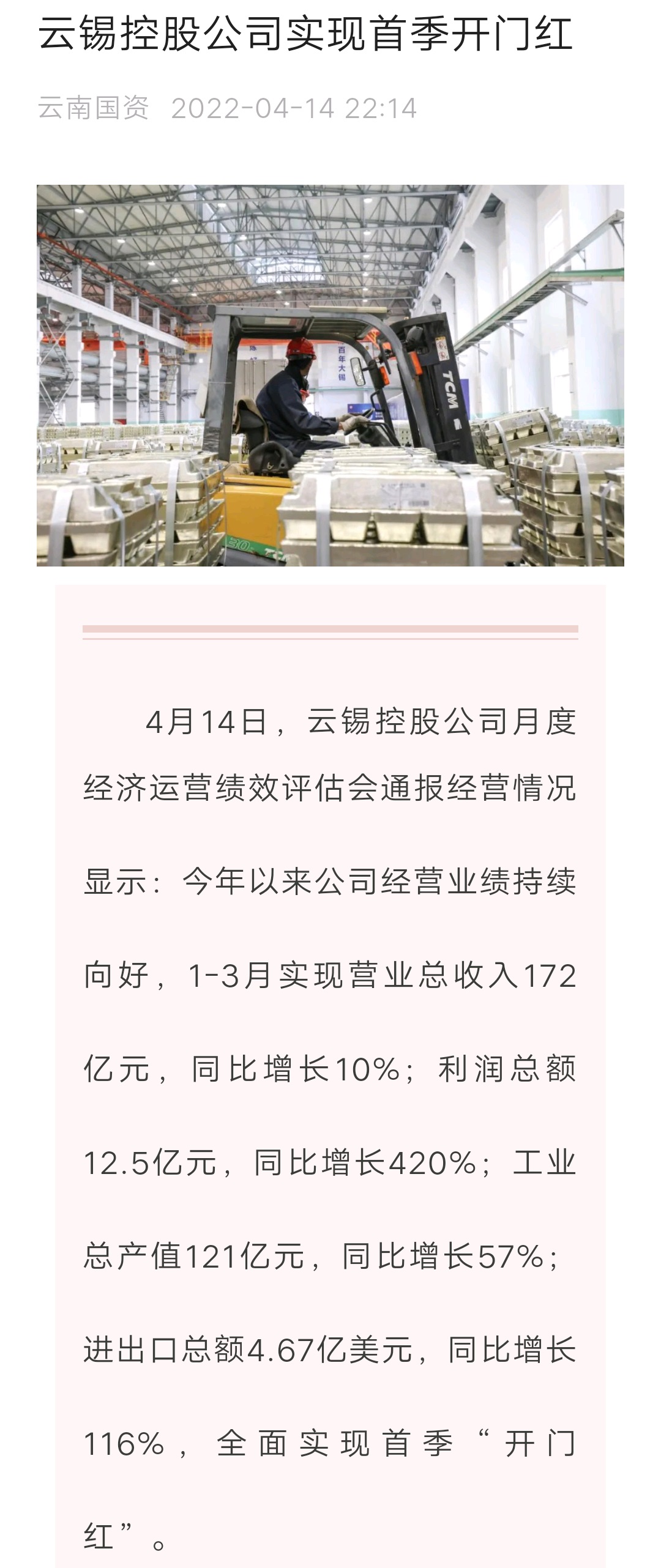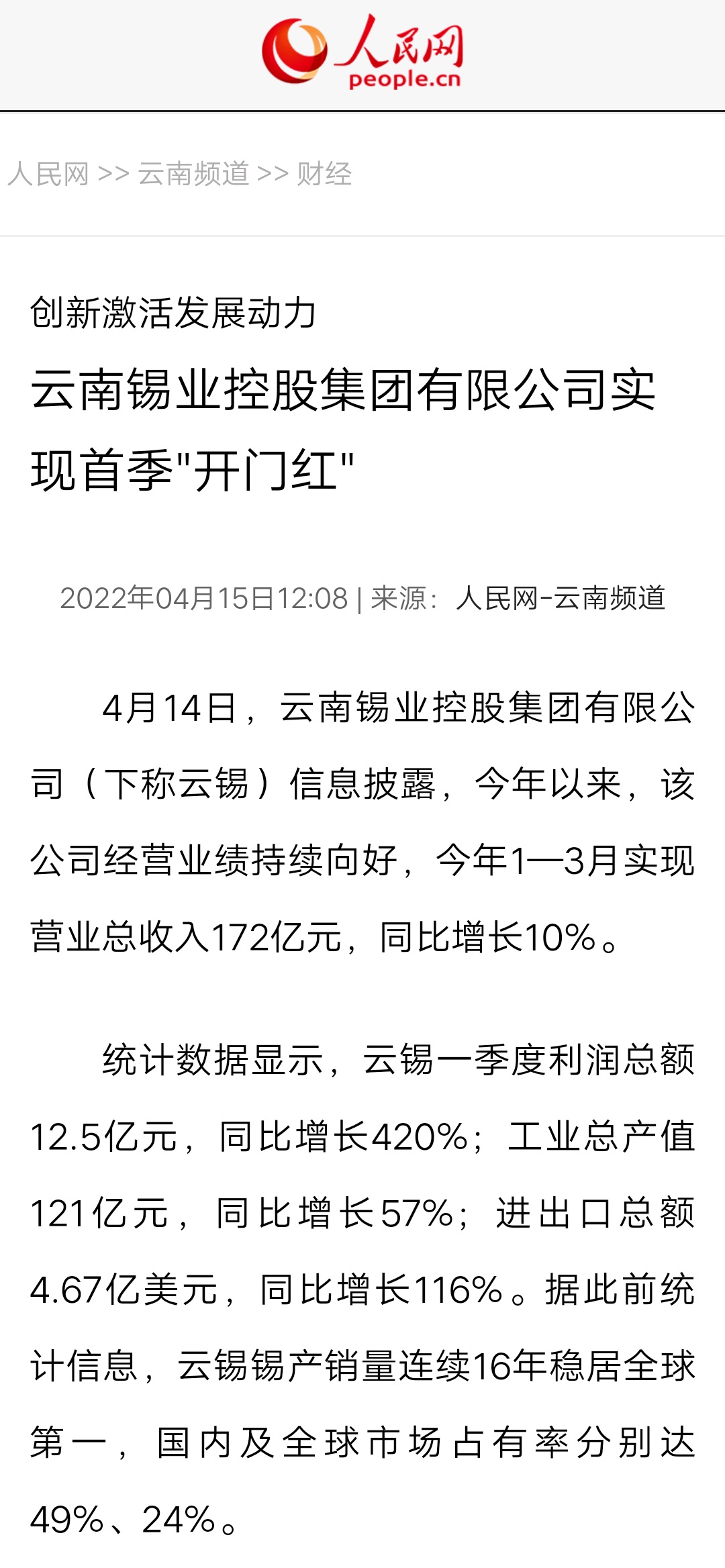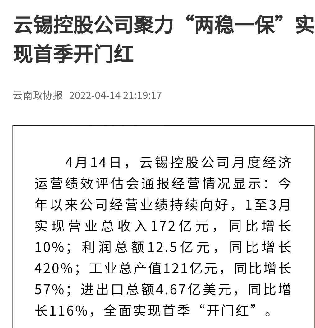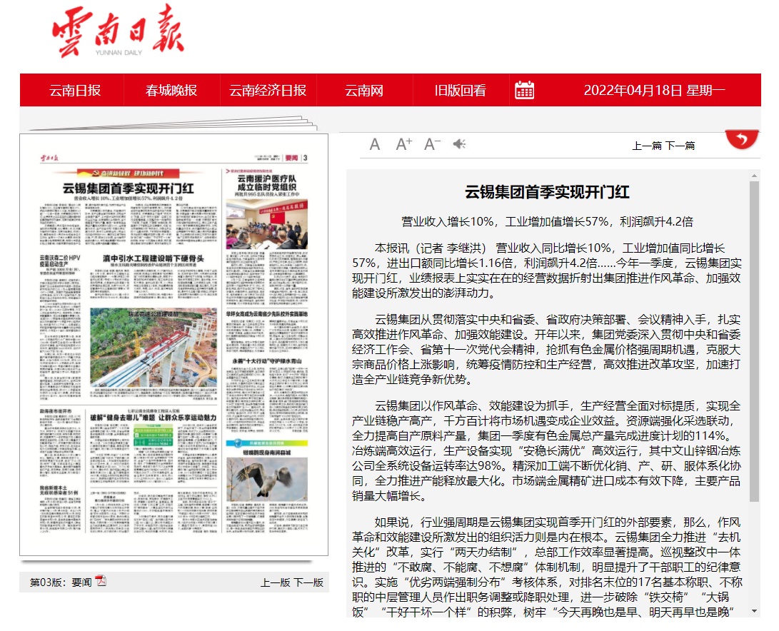 媒體關注| 人民網、新華財經、云報、云南國資等媒體關注云錫實現首季開門紅
