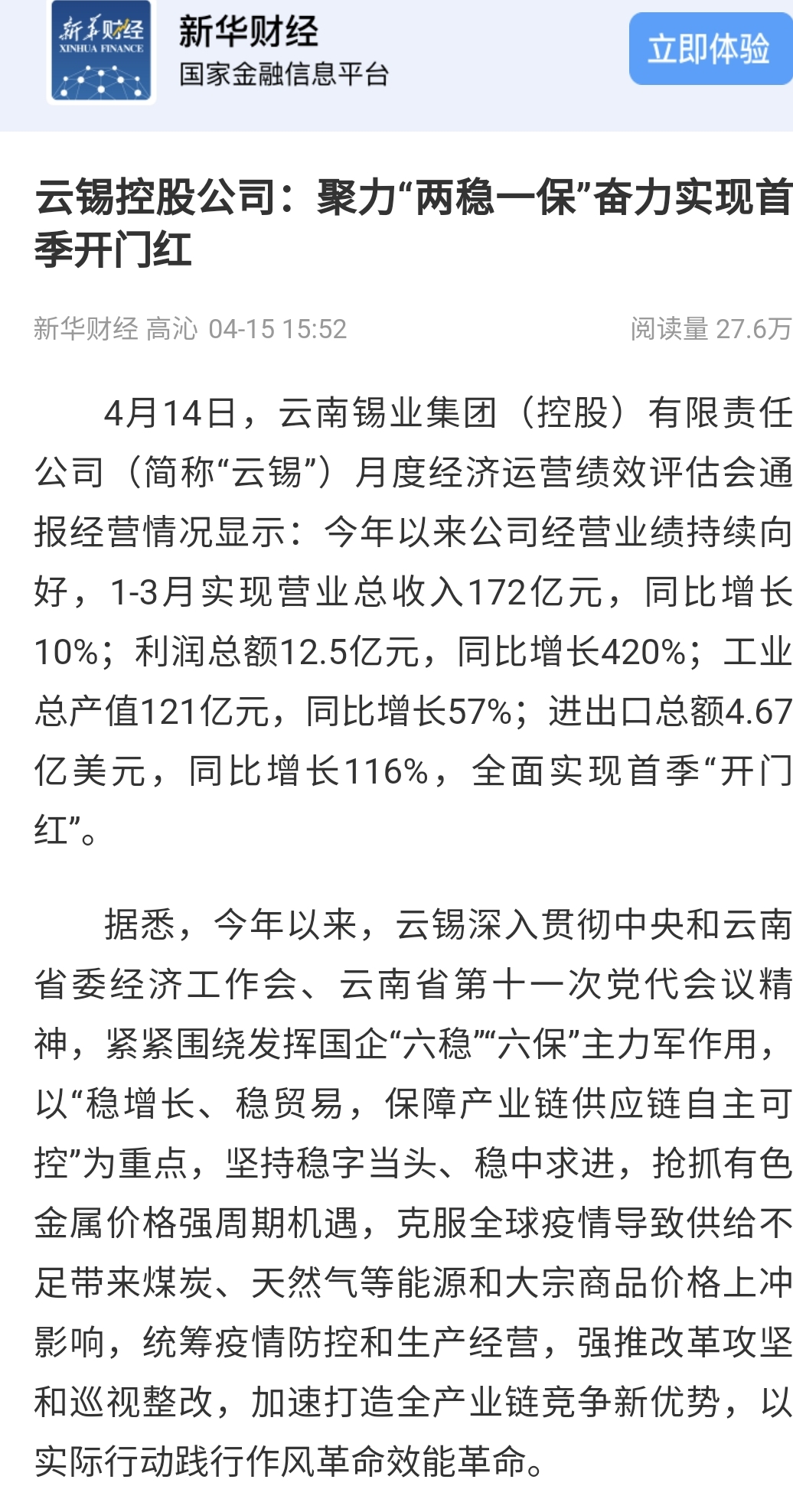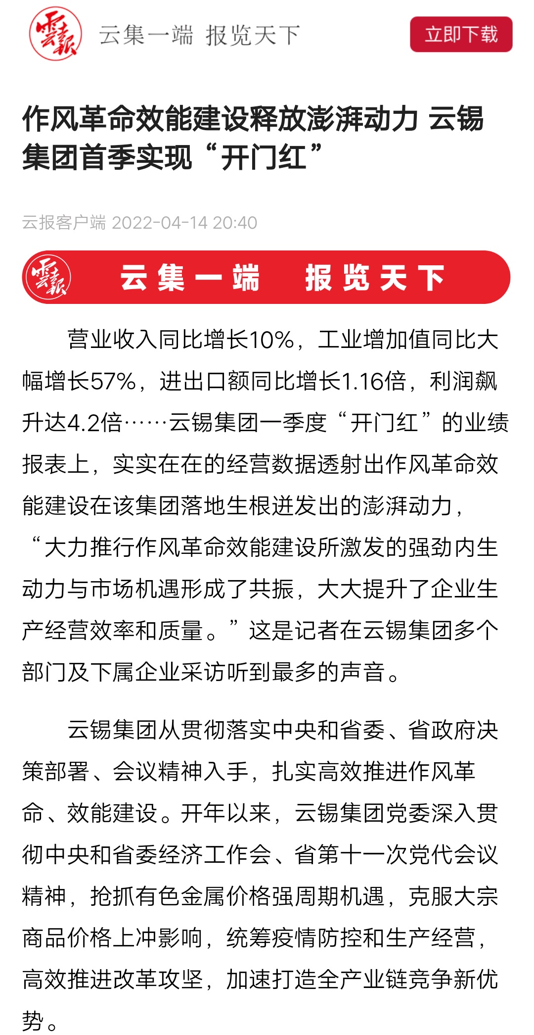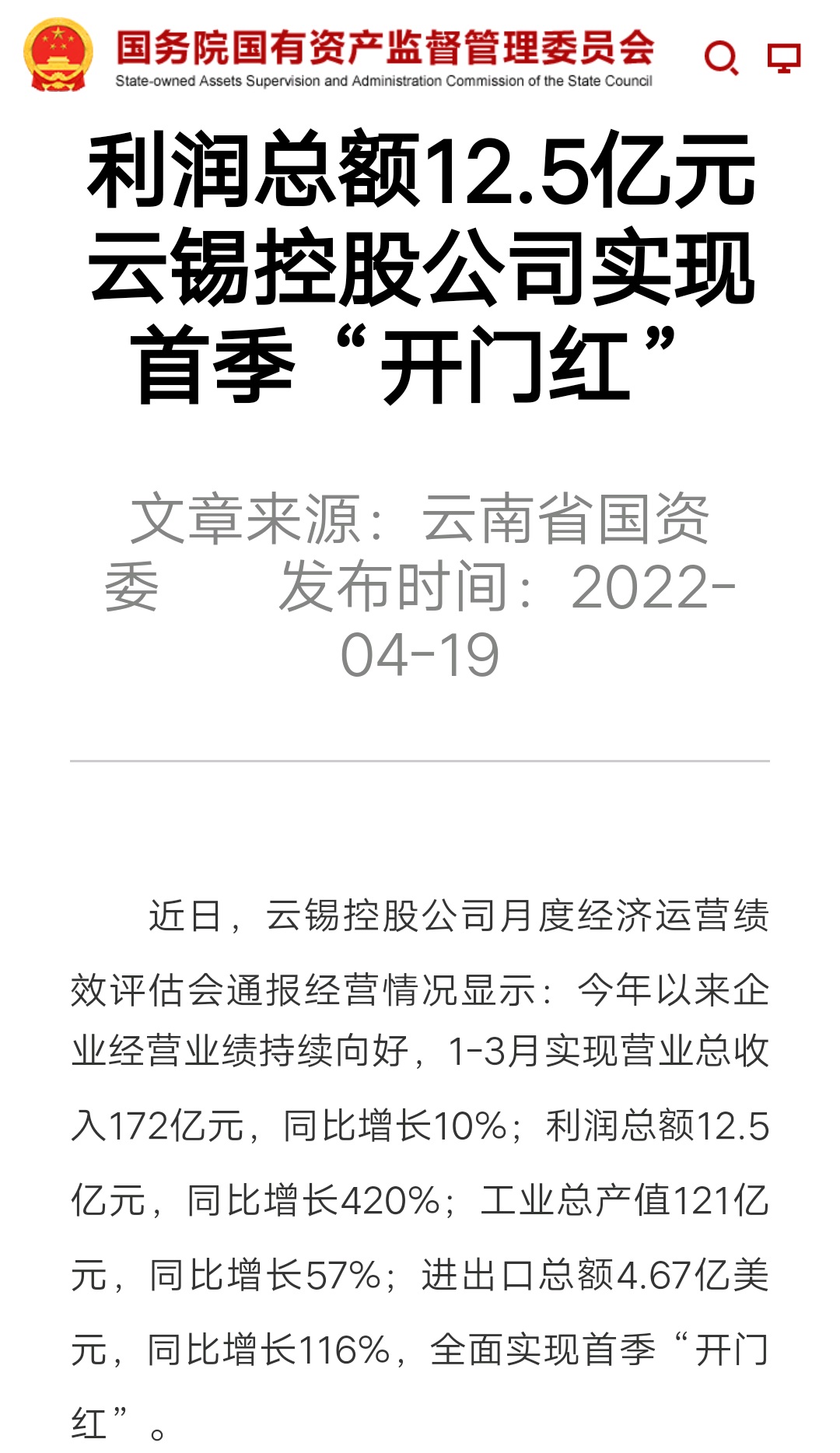 媒體關注| 人民網、新華財經、云報、云南國資等媒體關注云錫實現首季開門紅