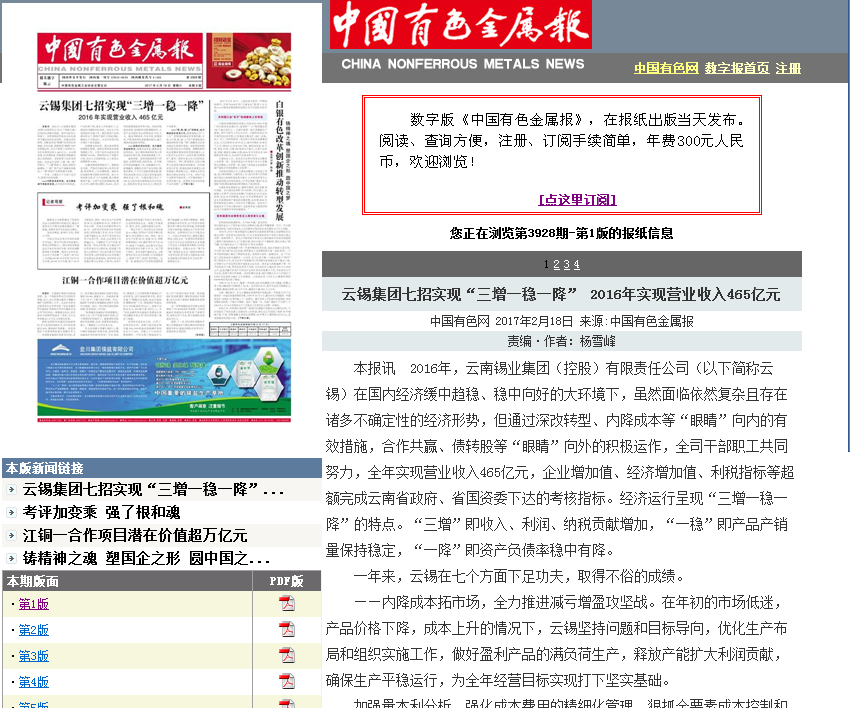 本報訊 2016年,云南錫業(yè)集團(控股)有限責任公司(以下簡稱云錫)在國內經濟緩中趨穩(wěn)、穩(wěn)中向好的大環(huán)境下,雖然面臨依然復雜且存在諸多不確定性的經濟形勢,但通過深改轉型、內降成本等“眼睛”向內的有效措施,合作共贏、債轉股等“眼睛”向外的積極運作,全司干部職工共同努力,全年實現營業(yè)收入465億元,企業(yè)增加值、經濟增加值、利稅指標等超額完成云南省政府、省國資委下達的考核指標。經濟運行呈現“三增一穩(wěn)一降”的特點。“三增”即收入、利潤、納稅貢獻增加,“一穩(wěn)”即產品產銷量保持穩(wěn)定,“一降”即資產負債率穩(wěn)中有降。 一年來,云錫在七個方面下足功夫,取得不俗的成績。 ——內降成本拓市場,全力推進減虧增盈攻堅戰(zhàn)。在年初的市場低迷,產品價格下降,成本上升的情況下,云錫堅持問題和目標導向,優(yōu)化生產布局和組織實施工作,做好盈利產品的滿負荷生產,釋放產能擴大利潤貢獻,確保生產平穩(wěn)運行,為全年經營目標實現打下堅實基礎。 加強量本利分析,強化成本費用的精細化管理,狠抓全要素成本控制和降低工作,主營產品作業(yè)成本比預算降低14.15%。圍繞勞動生產率提升目標,優(yōu)化人力資源結構,人工成本比預算降低4.44%。 在融資極度困難情況下,置換高息負債,嚴格對外接待和公務用車管理,財務費用、三公經費降低。緊抓有色金屬價格反彈的有利時機,加大市場拓展力度,擴大產品銷量,最大限度釋放產能,主營產品內貿銷量同比增長9.17%,銷價同比增長24.66%。充分利用套期保值等多種手段,防控價格波動風險。加強原料采購策略研究,主營產品采購價差比預算創(chuàng)效7710萬元。通過內降成本、外拓市場、挖潛創(chuàng)效、嚴格考核等攻堅措施的落實,減虧增盈攻堅戰(zhàn)收效明顯。 ——多措并舉出實招,全力確保資金鏈安全。清理沉淀資金,提高資金使用效率。加大債權清收和存貨占用資金的壓縮力度,資金流轉速度上升。 盤清家底,加快閑置低效資產的盤活、處置和變現,回收資金。扎實做好傳統(tǒng)間接融資工作,創(chuàng)新融資方式,新增融資。調整優(yōu)化資產資本結構,降低負債率。千方百計搶抓政策機遇,順利完成首批22億元國企深改基金轉增資本金工作。與建設銀行簽訂了100億元的市場化債轉股系列合作協(xié)議,首批到位資金22.5億元,降低資產負債率。 ——“調、轉、破、立”四維度,全力推進深化改革工作。緊緊圍繞公司“十三五”發(fā)展規(guī)劃確定的發(fā)展思路、目標,從“調、轉、破、立”四個維度推進實施深改轉型方案。“調”:調整優(yōu)化總部功能定位和組織架構,加快投資控股型總部頂層設計的落地。調整扭轉傳統(tǒng)過度集權攬事的經營管控模式,以6家試點企業(yè)先行,全面實施“松綁放權”,激發(fā)二級單位獨立自主經營的活力和動力。“轉”:轉變觀念,總結云錫多元化投資失敗的深刻教訓,切實轉變盲目擴張、冒進投資的發(fā)展觀念,將發(fā)展重心聚焦錫主業(yè),將錫主業(yè)的發(fā)展動力鎖定在深加工產業(yè)。加快產品產業(yè)轉型升級步伐,召開錫材錫化工改革發(fā)展大會,依靠技術進步加快新產品市場推廣,推動云錫產品產業(yè)從產業(yè)鏈低端向高技術含量、高附加值轉型升級。“破”:打破同類業(yè)務管理分散和低效的局面,圍繞集約化協(xié)同發(fā)展的目標,實施了錫業(yè)股份個舊東部礦山采選一體化改革,完成了廣元公司與大酒店的整合。破冰產銷脫節(jié)的痼疾,按產購銷一體化格局,推進營銷體系改革。突破體制機制的束縛,加大三項制度改革力度,大力推進控股公司總部新一輪的“三定”和薪酬考核體系改革。“立”:圍繞控股公司產業(yè)培育目標,改制成立了物流公司、研究院公司和前海融資租賃公司并有序開展業(yè)務,為云錫貿易金融業(yè)務和科技服務產業(yè)打下了良好基礎。 ——責任擔當勇作為,全力化解風險和處置歷史遺留問題。群策群力,艱苦博弈,據理力爭,積極推進房地產項目風險化解工作。西房項目“退二進一”,天晉項目學區(qū)房去庫存。石林項目、云錫同樂、煤機廠、元江鎳業(yè)公司、建水兩個公司問題的解決在曲折中積極推進。 ——創(chuàng)新驅動,重點突破,全力培育轉型升級發(fā)展新動力。積極打造云錫新材料產業(yè),打造 “兩中心、三基地”,即世界級錫基新材料研發(fā)中心、省級的銦系列材料研發(fā)中心、世界最大的錫基新材料產業(yè)基地、世界最大的錫化工產業(yè)基地、云南銦系列新材料產業(yè)基地。通過與國際錫協(xié)、美國銦公司的廣泛、深入合作加快推進各項工作。 ——超前謀劃搶先機,全力搶抓政策爭取機遇。云錫成功抓住國家實施降低企業(yè)杠桿率政策機遇,成為全國首家地方國企市場化債轉股項目試點企業(yè),對改善云錫融資環(huán)境具有重要的現實意義,對云錫樹立良好的社會形象起到重要的示范效應。積極爭取云南省國企深改基金,云錫成為云南省首批國企深改基金的受益企業(yè)。 率先實施省內市場化直購電及電力市場化競價交易,全年降低用電成本1.5億元。各部門、單位緊抓國家和各級地方政府穩(wěn)增長系列政策機遇,全年預計爭取政策資金對公司減虧增盈起到較好支撐作用。加大與商務