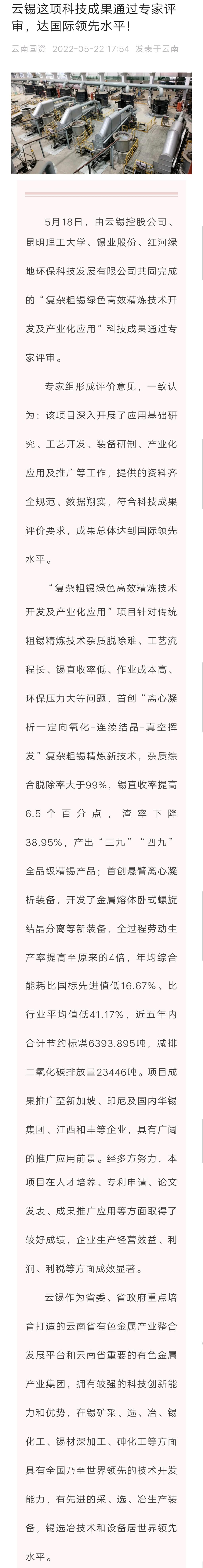 云南國資:云錫這項科技成果通過專家評審,達國際領先水平!