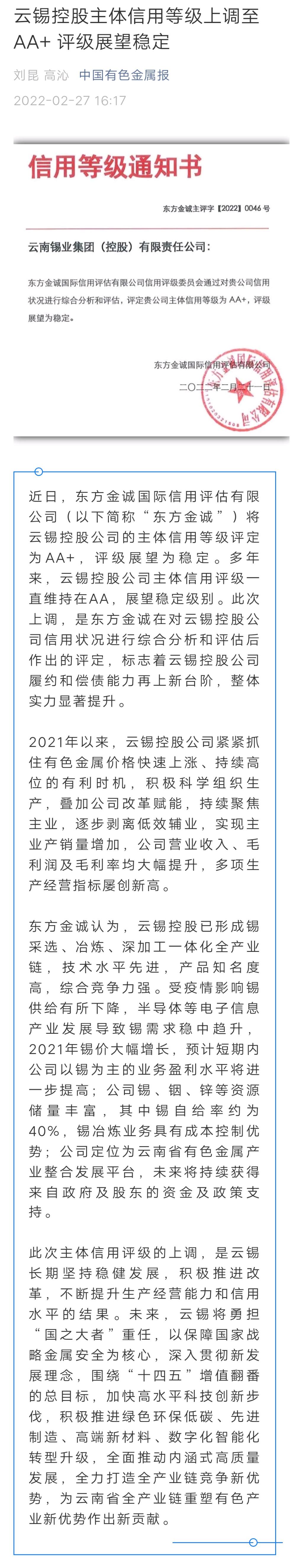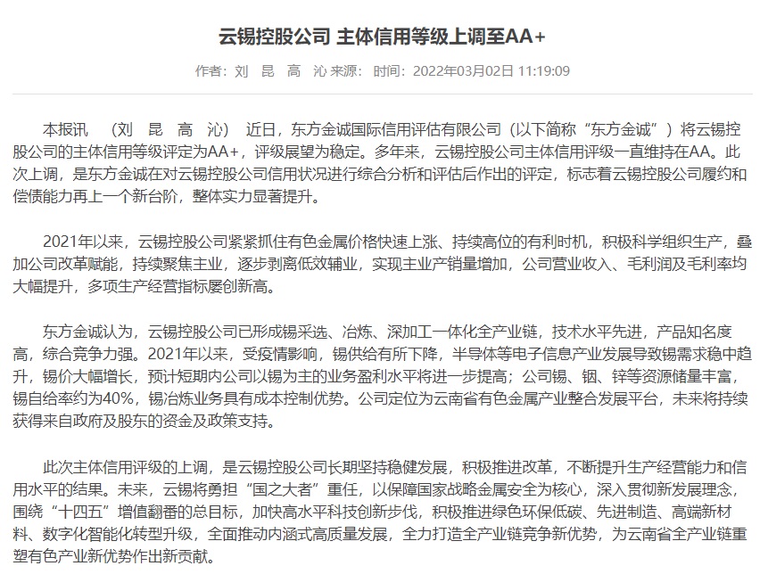 云南政協報、中國有色金屬報:云錫控股主體信用等級上調至AA+ 評級展望穩定