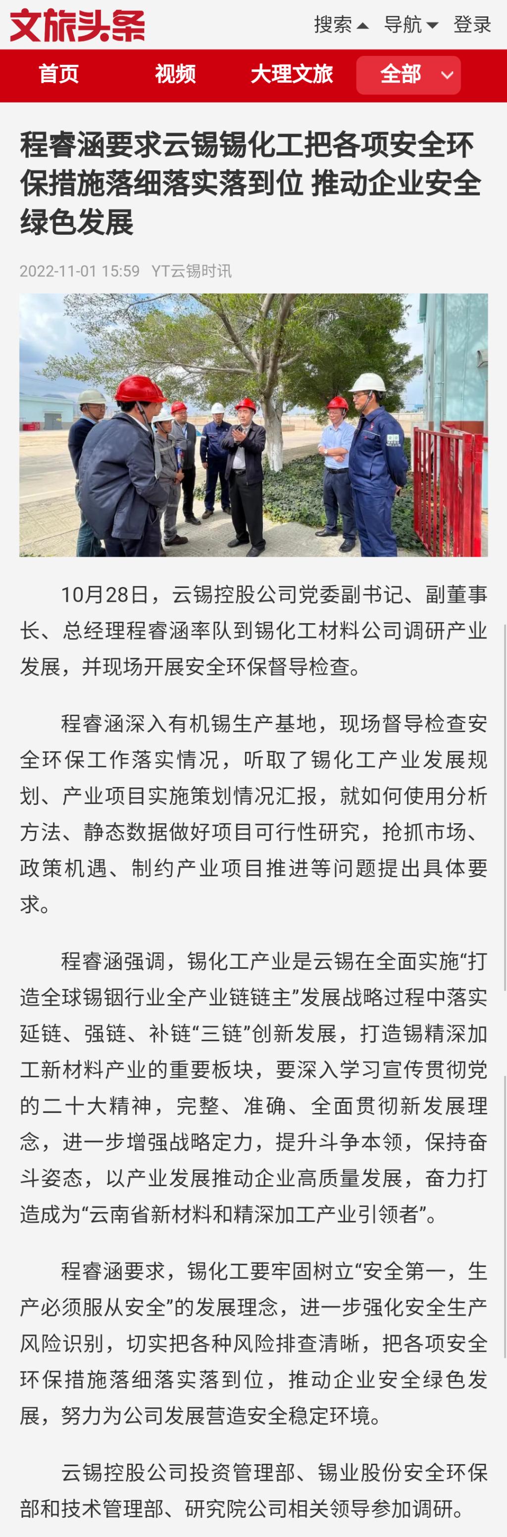 文旅頭條:程睿涵要求云錫錫化工把各項安全環保措施落細落實落到位 推動企業安全綠色發展