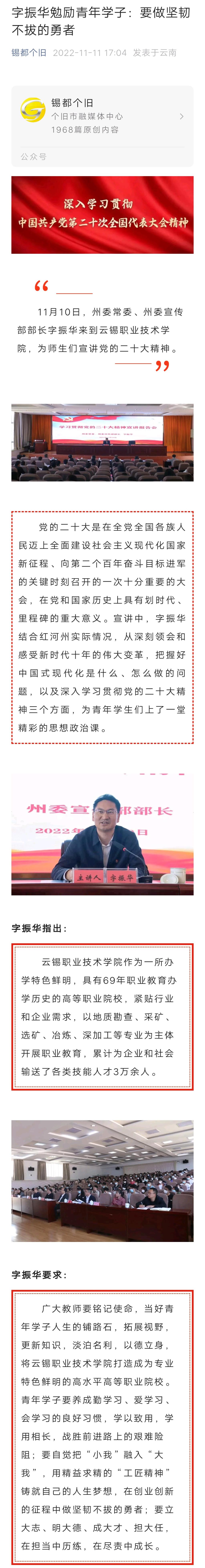 錫都個(gè)舊:紅河州委宣傳部部長(zhǎng)字振華到職業(yè)學(xué)院宣講黨的二十大精神
