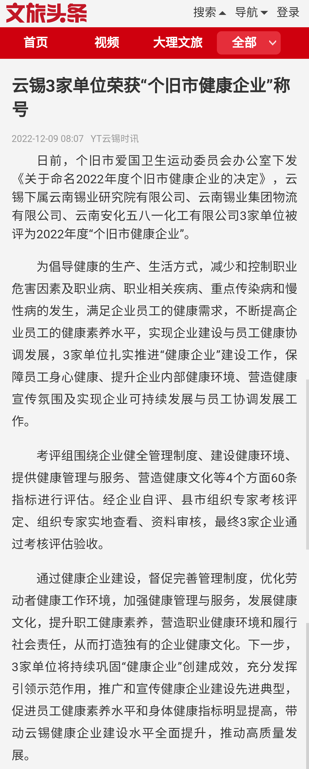 文旅頭條:云錫3家單位榮獲“個舊市健康企業”稱號