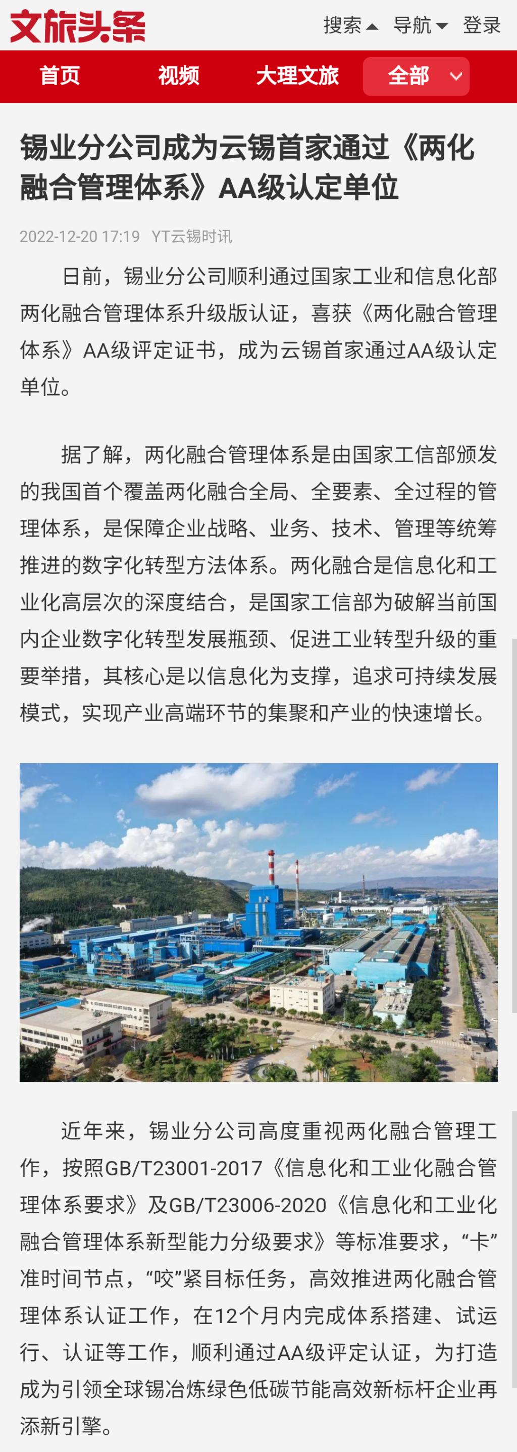 文旅頭條:錫業分公司成為云錫首家通過《兩化融合管理體系》AA級認定單位