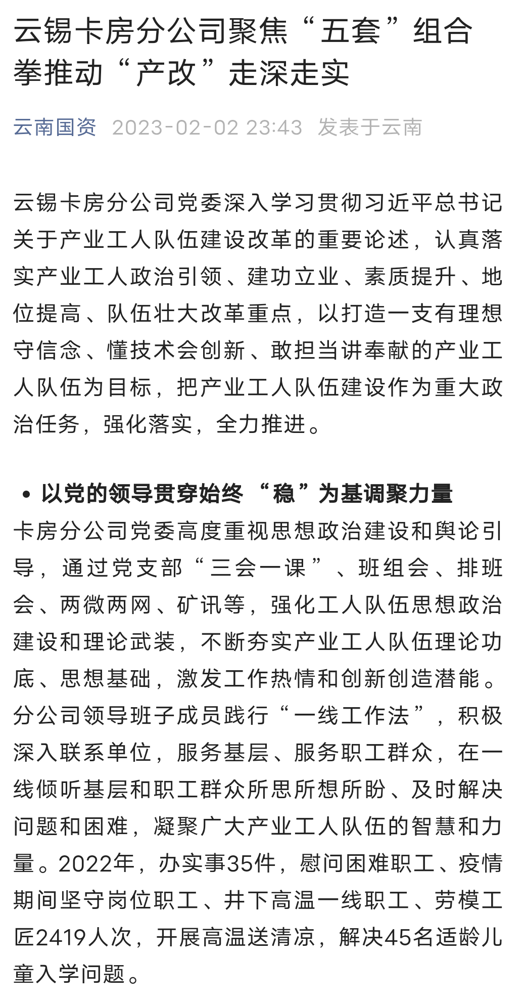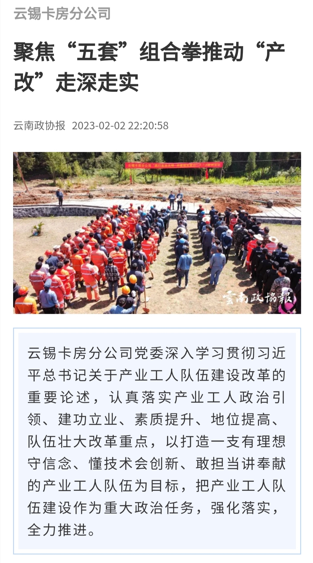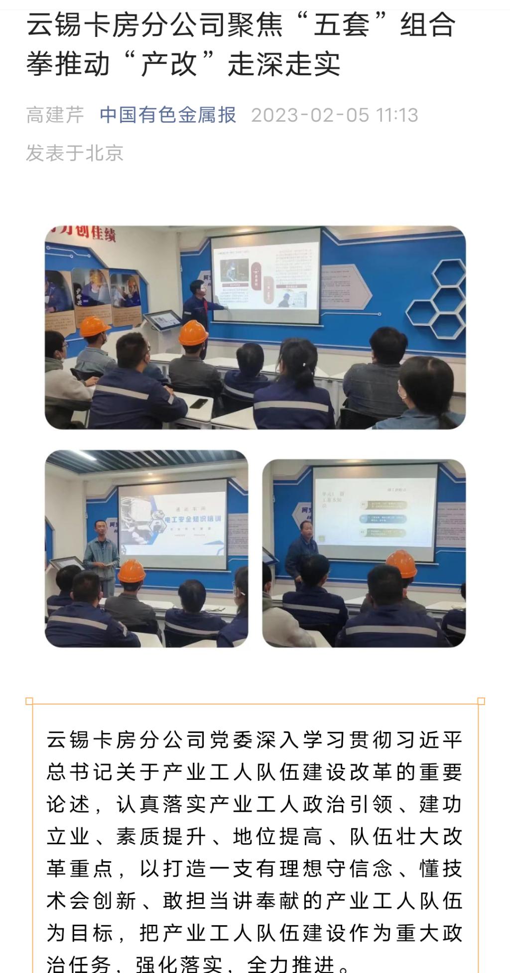 云南國資、云南政協報、中國有色金屬報、文旅頭條:云錫卡房分公司聚焦“五套”組合拳推動“產改”走深走實