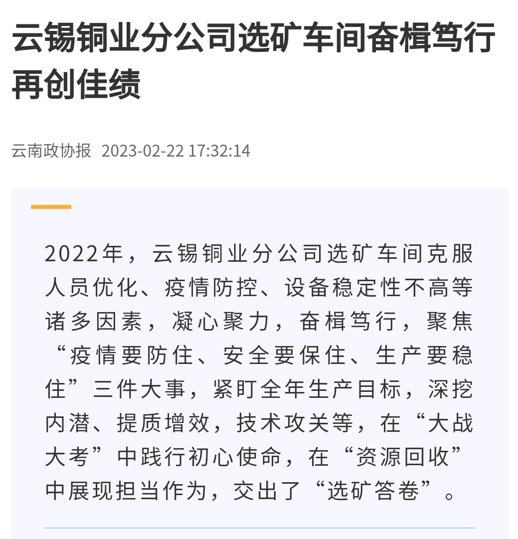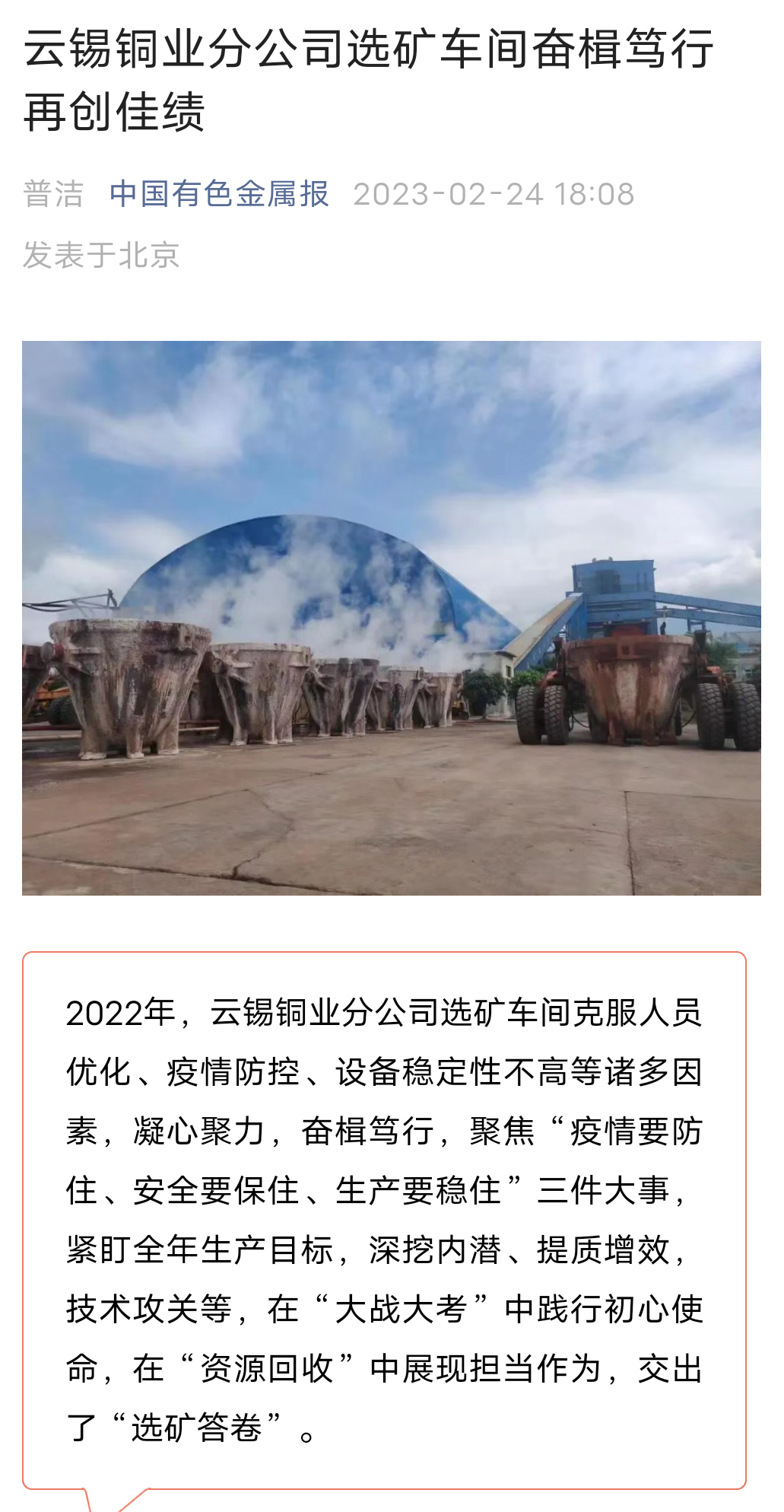 云南政協報、中國有色金屬報、文旅頭條:云錫銅業分公司選礦車間奮楫篤行再創佳績