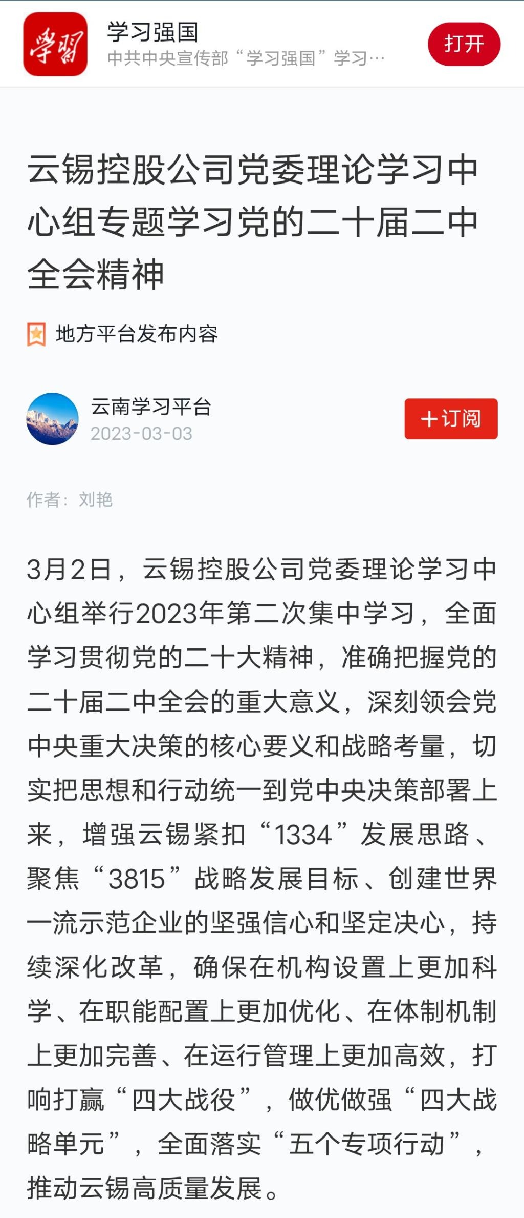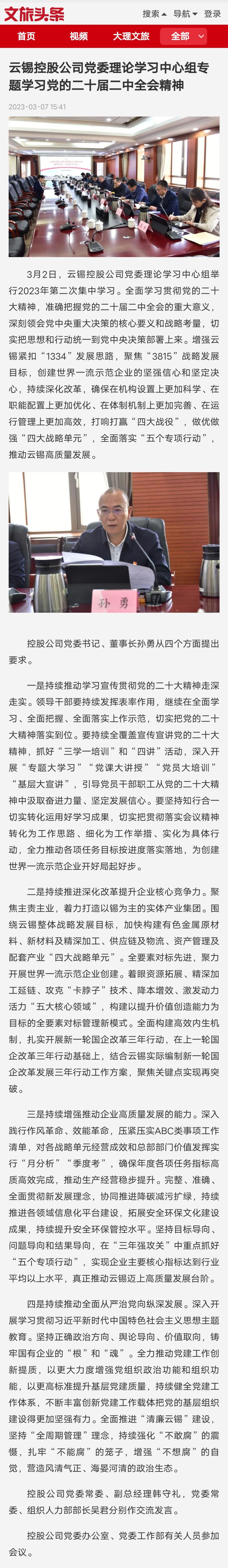 學習強國、文旅頭條:云錫控股公司黨委理論學習中心組專題學習黨的二十屆二中全會精神