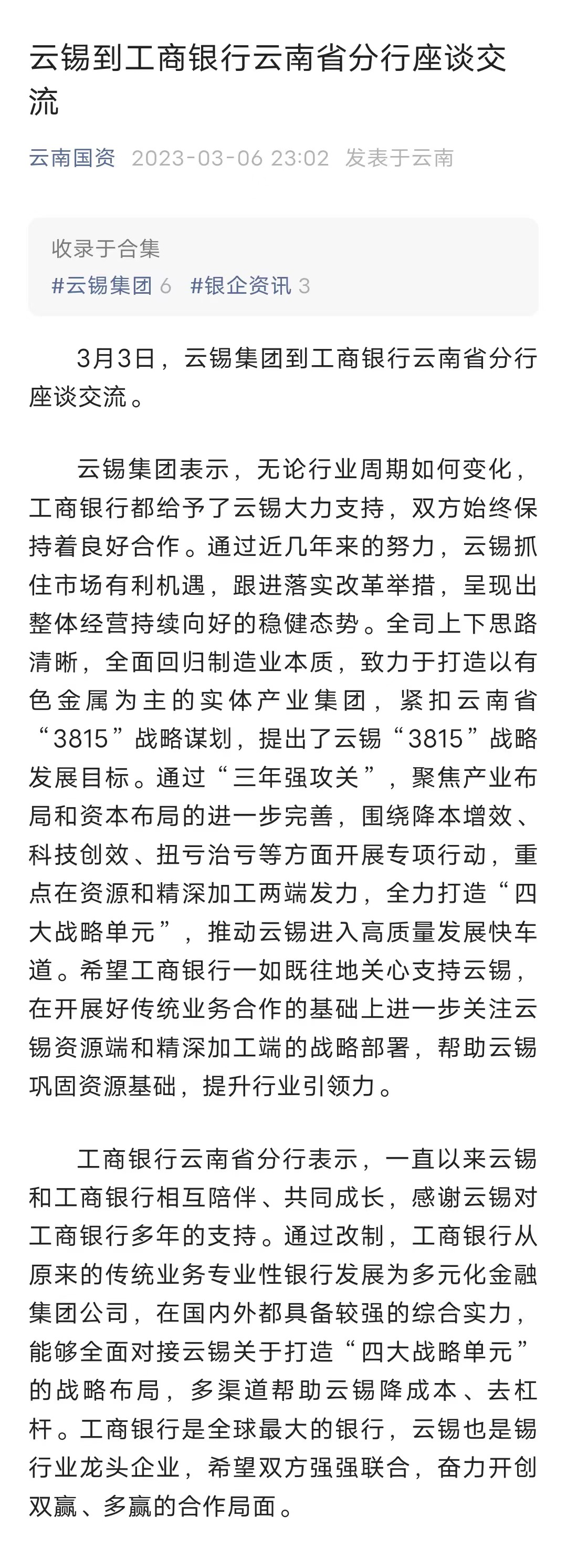 云南國資:云錫到工商銀行云南省分行座談交流